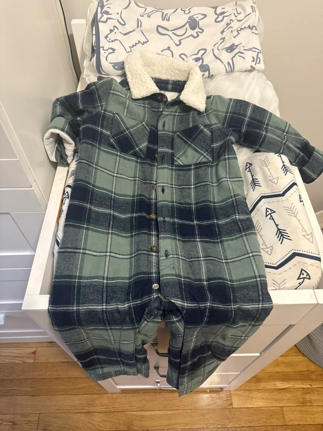 60This adorable baby onesie features a green and navy blue flannel plaid pattern and a cozy white sherpa collar. It's in great condition and perfect for keeping your little one warm and stylish! The onesie has long sleeves and a button-up front, making it easy to dress your baby. It's a cute and practical addition to any baby's wardrobe