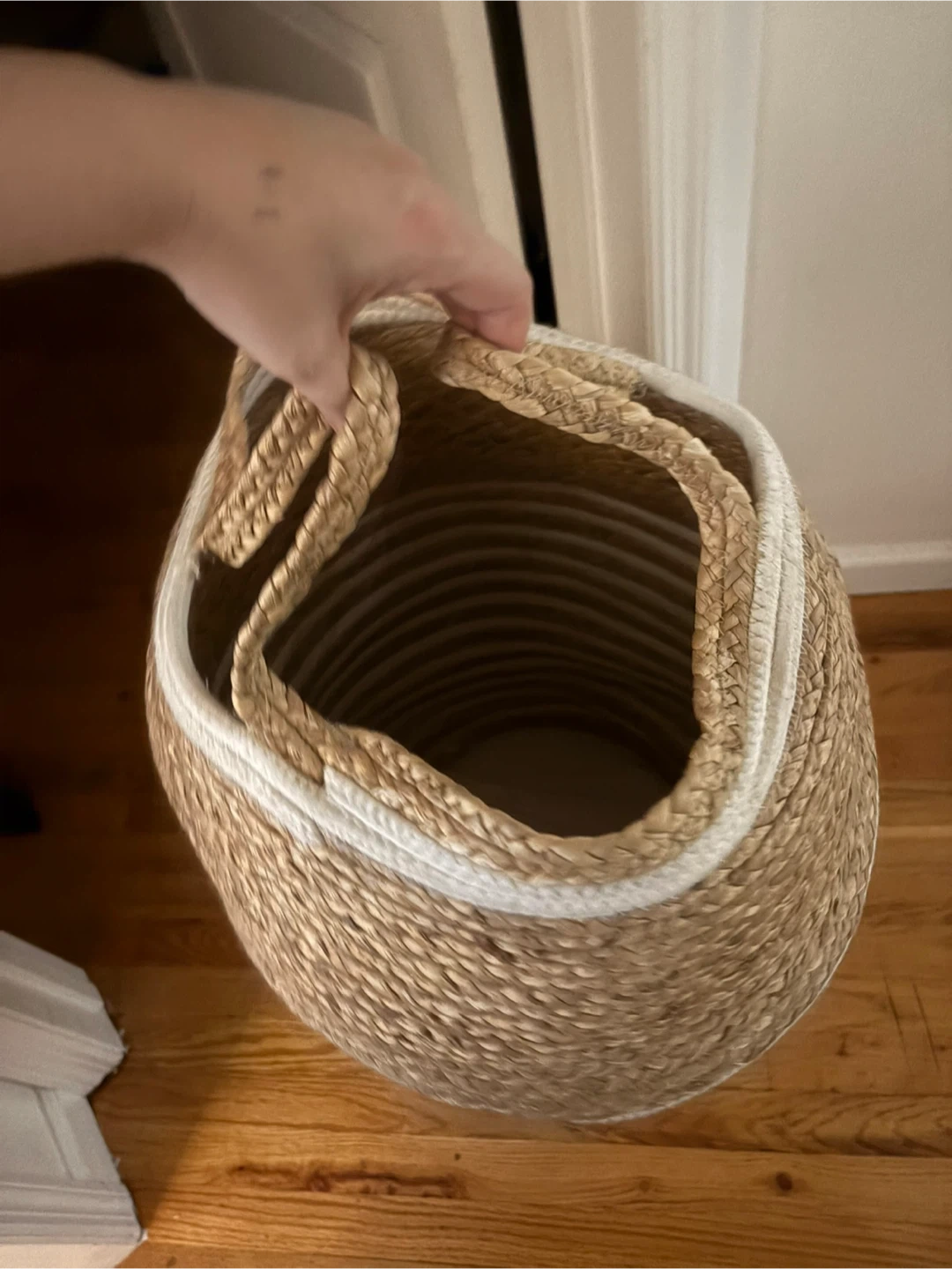 Selling a woven basket with handles! It features a natural woven texture with white stripes around the base and top. Perfect for storage or decor. -It folds down into a smaller basket size -Can be used as a hamper, for toiletries, linens, blankets, etc -New was about $50