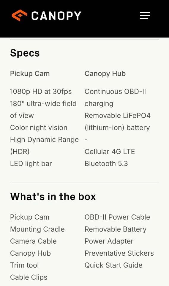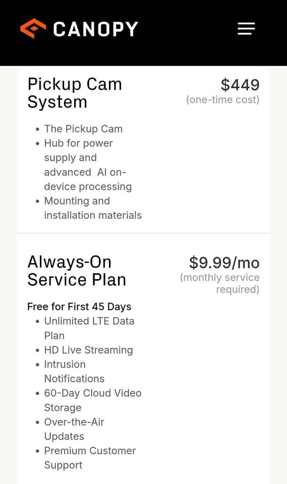 77Brand new Canopy Pickup Cam security system. Got it as a gift; but it's made for open pickup beds. I have a softopper and a rack so it doesn't work for me. Any reasonable offer accepted