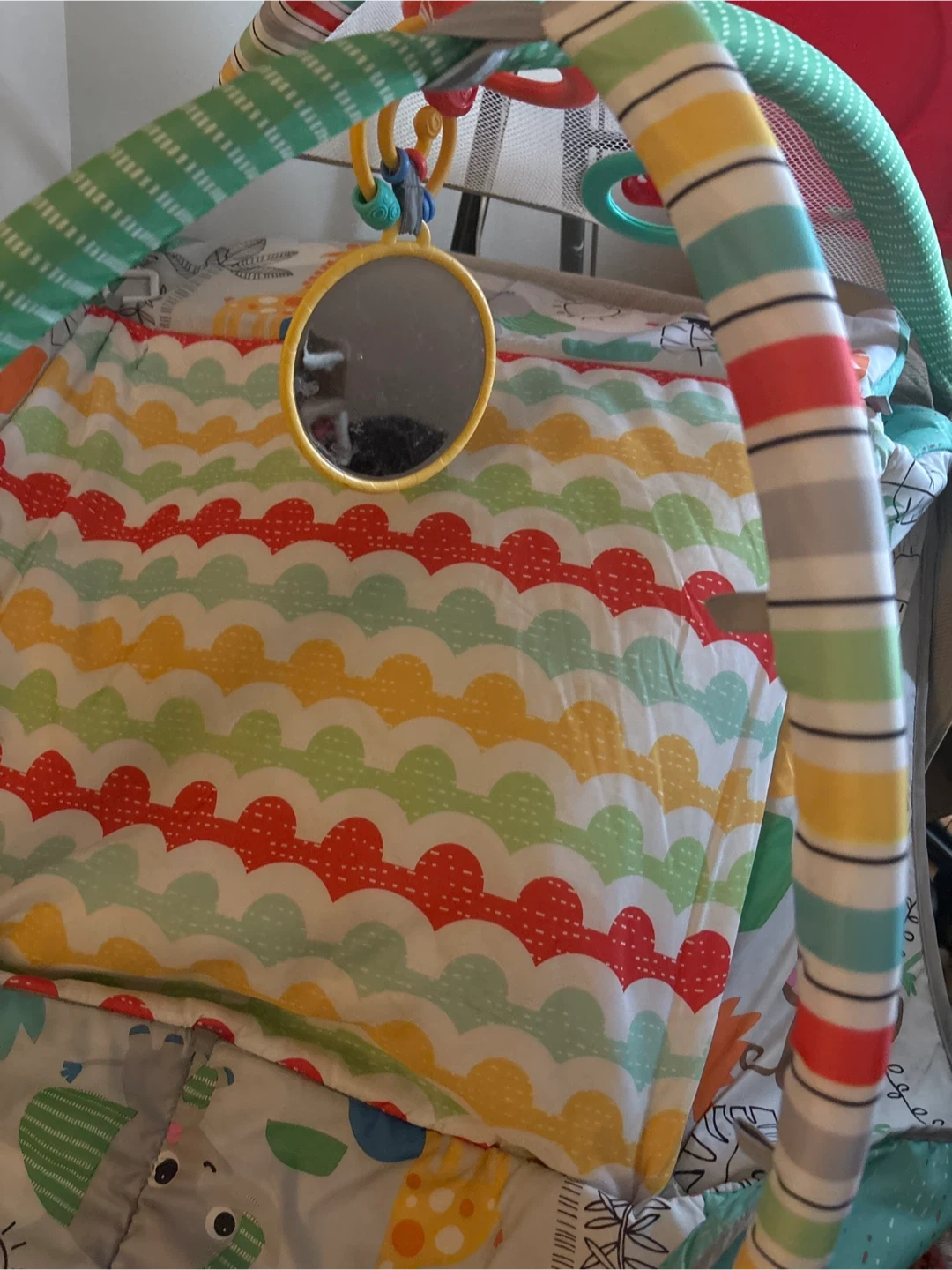 134Here's a colorful baby activity gym! It features overhead toys to keep your little one entertained. The mat has a fun pattern with red, yellow, green, and white colors which is good for infants and newborns when their eye sight is still fuzzy. It keeps them distracted and entertained. -Good for babies to kick to get a feel for their body and learn about cause effect -Machine washable -Bought for $50