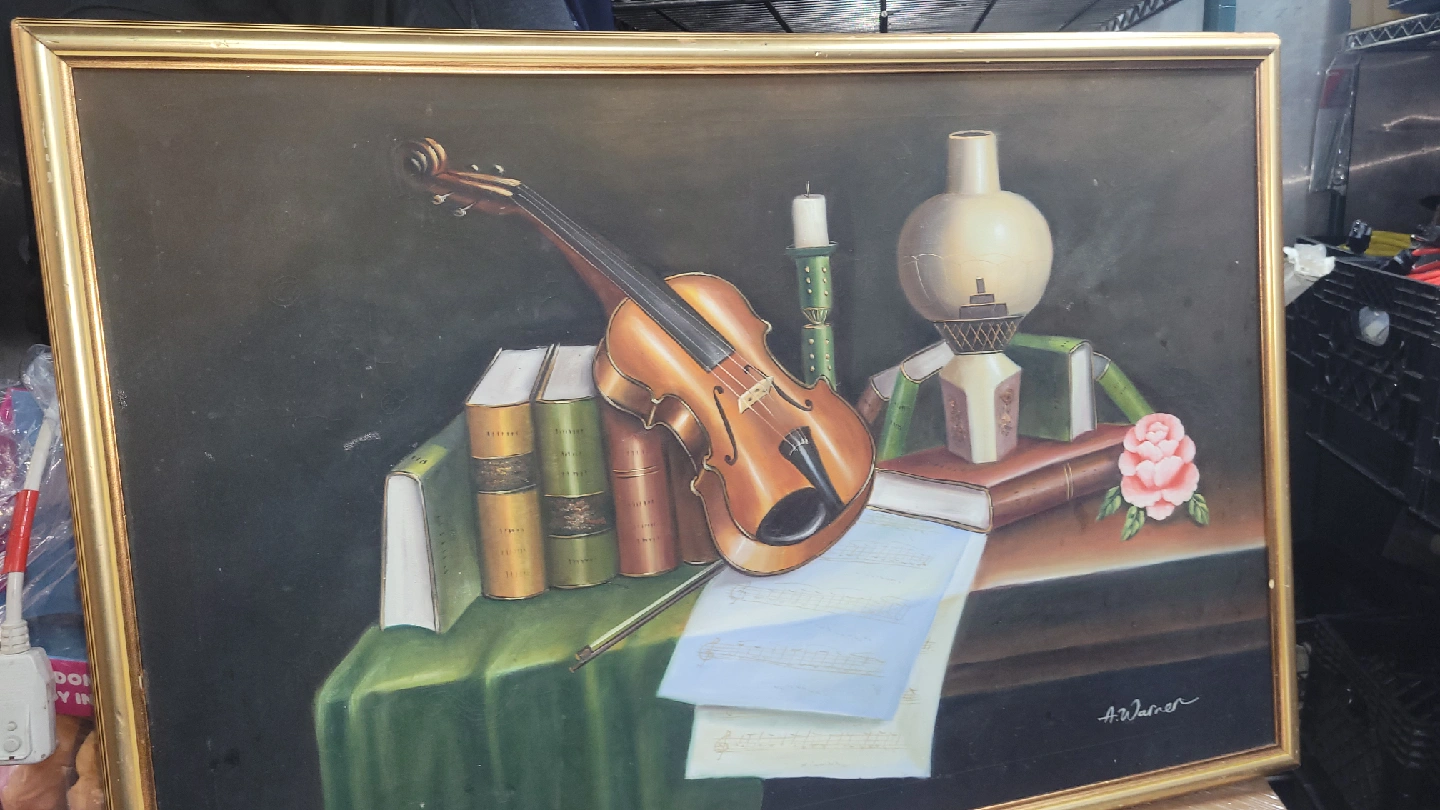 Selling a vintage painting signed by A. Warner. It features a still life scene with a violin, books, and a flower. The painting is framed and ready to hang, adding a touch of classic elegance to any room