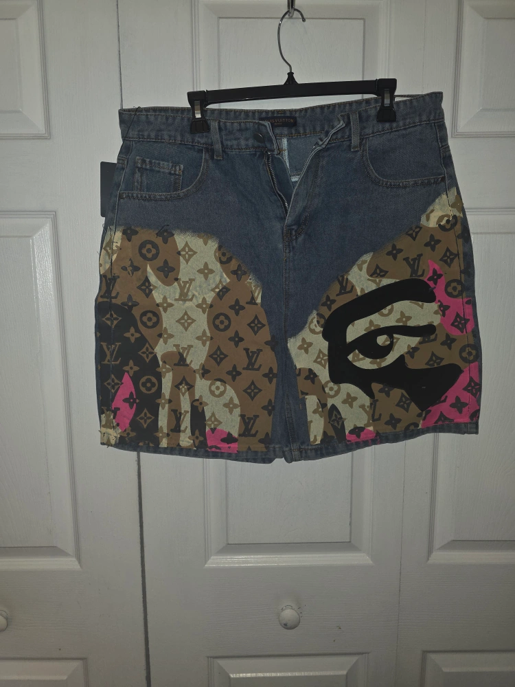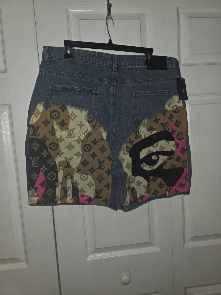 465Selling these custom denim shorts featuring a Louis Vuitton pattern and a unique eye design. They're a statement piece for sure! The shorts are denim with a custom design.