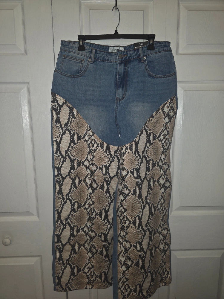 These are a pair of Fashion Nova jeans in size 13. They feature a unique snakeskin pattern design. These jeans are perfect for adding a bold statement to your wardrobe