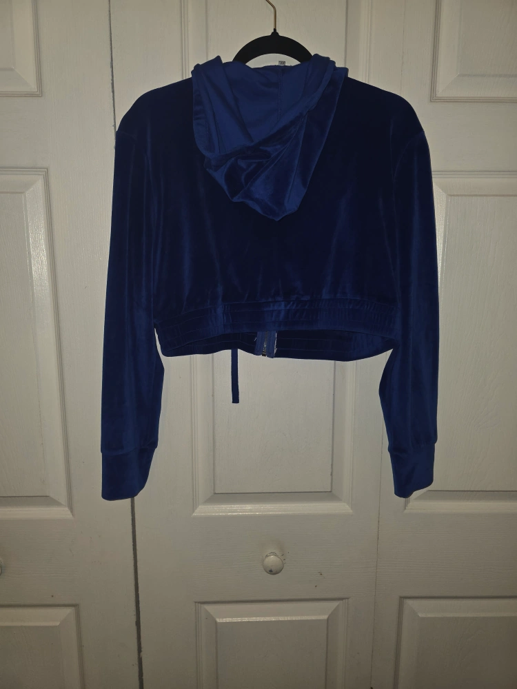 Selling a blue velvet tracksuit. It includes a zip-up hoodie and matching pants. The material is soft and comfortable, perfect for lounging or casual wear