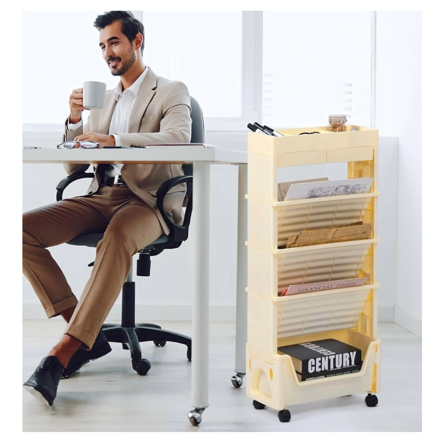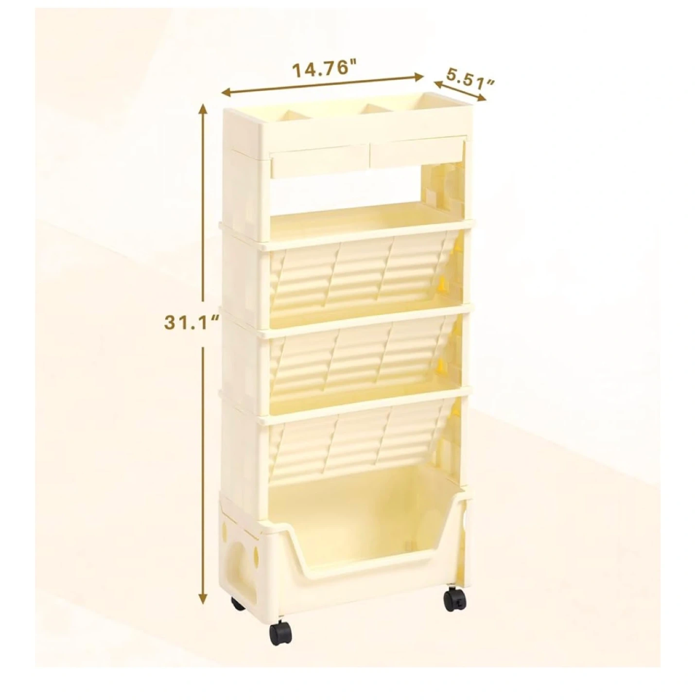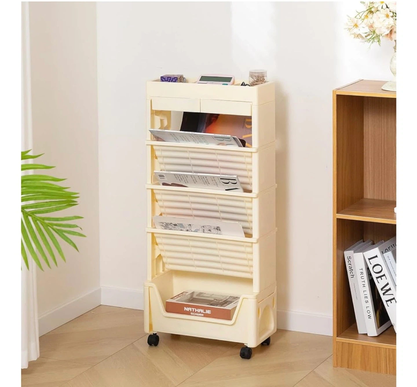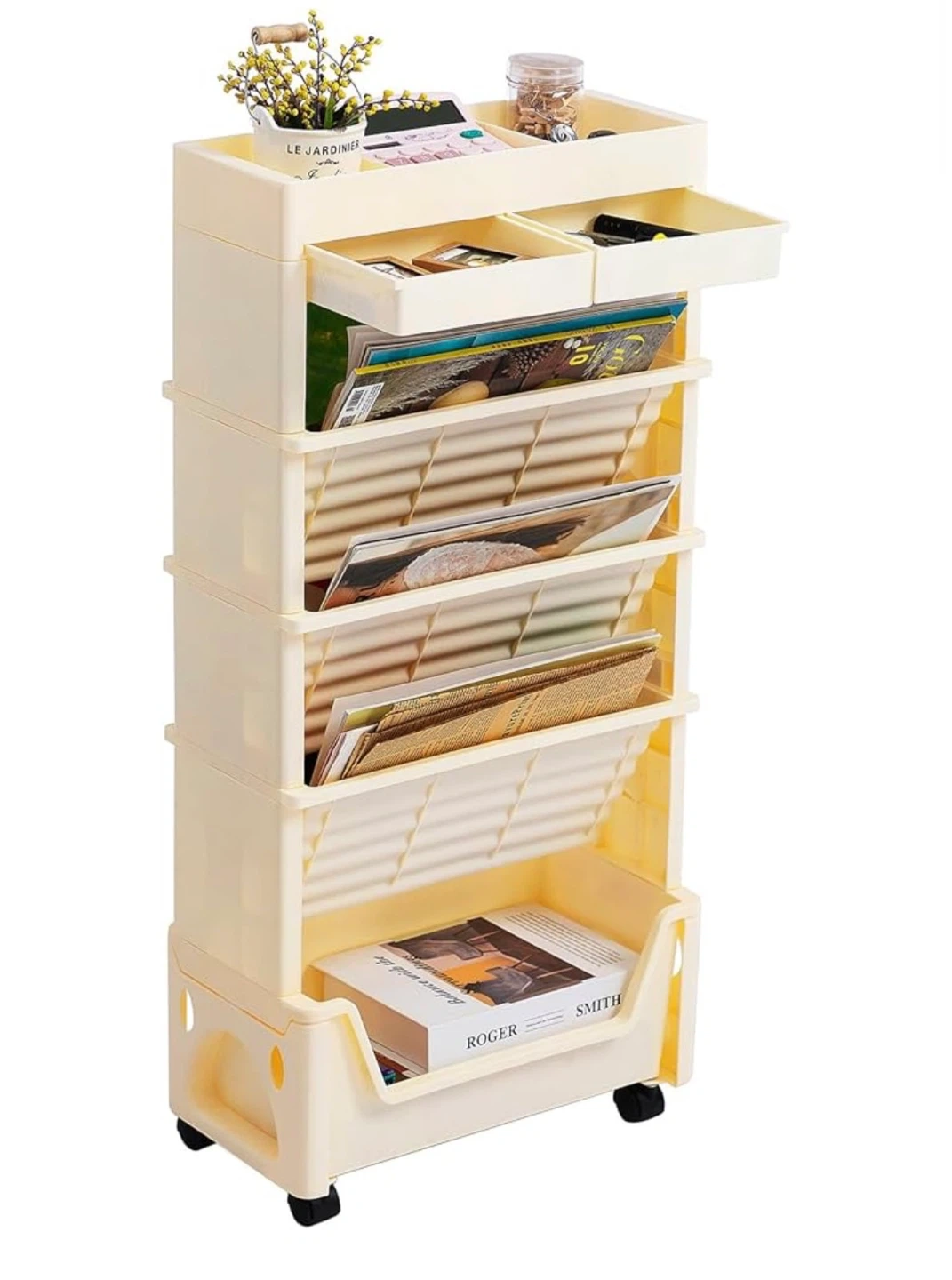 Looking to organize your space? This 5-tier rolling storage cart is perfect for storing books, documents, or even small items! It's beige in colour and features a top shelf with compartments and a drawer for added convenience. The cart is on wheels, making it easy to move around your home or office