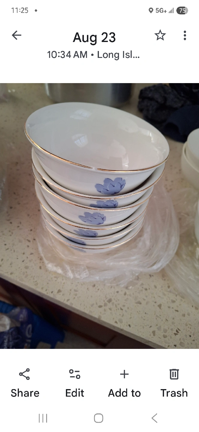 Selling a set of six white bowls, each featuring a delicate blue floral design and a gold trim. They're in great condition and ready for a new home!