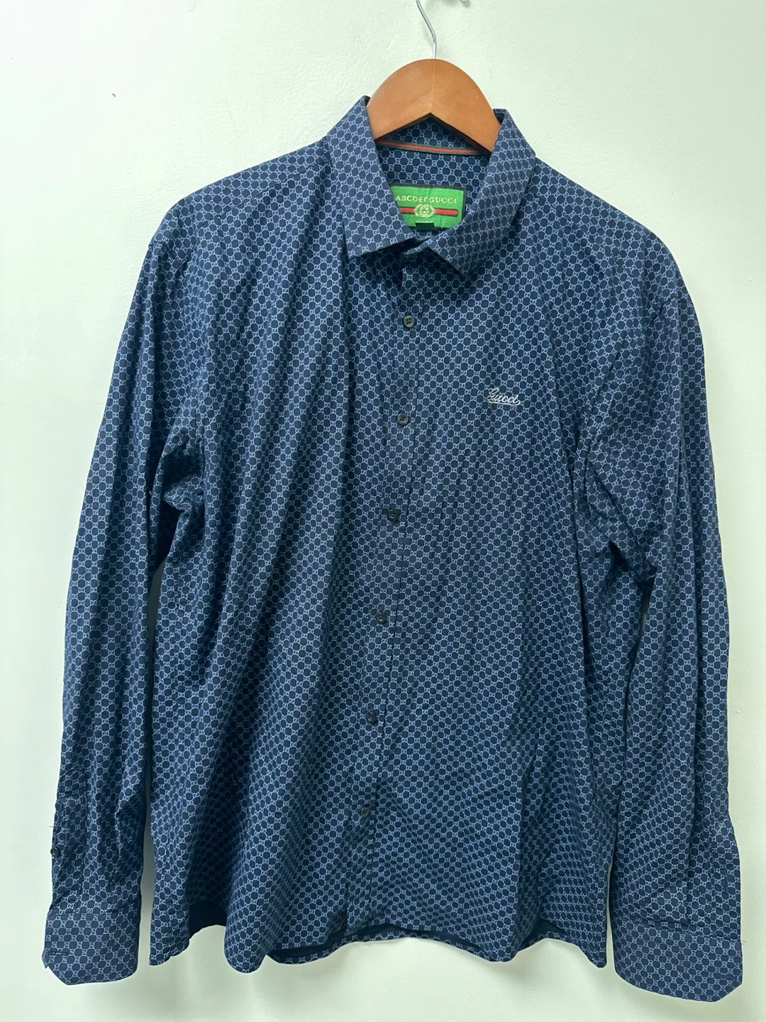 188Here's a stylish Gucci men's long-sleeved shirt featuring a unique pattern. It's in great condition and ready to wear! The shirt has the 'ABCDEFGUCCI' logo on the tag.
