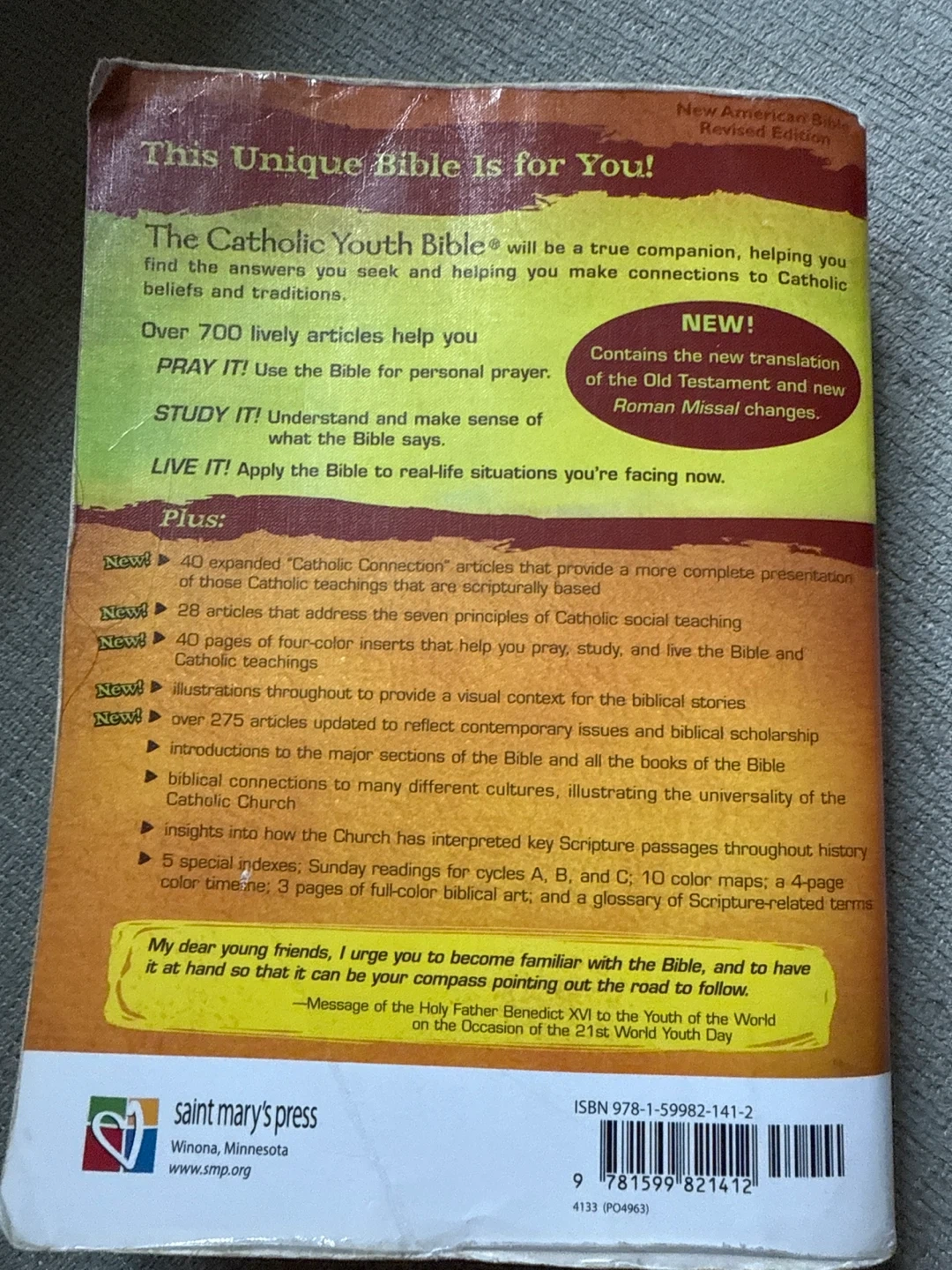I’m giving away a used copy of The Catholic Youth Bible by Saint Mary's Press. It is a revised edition of the New American Bible. This bible includes over 700 lively articles, expanded Catholic connections, and colorful inserts to help you study, pray, and live it
