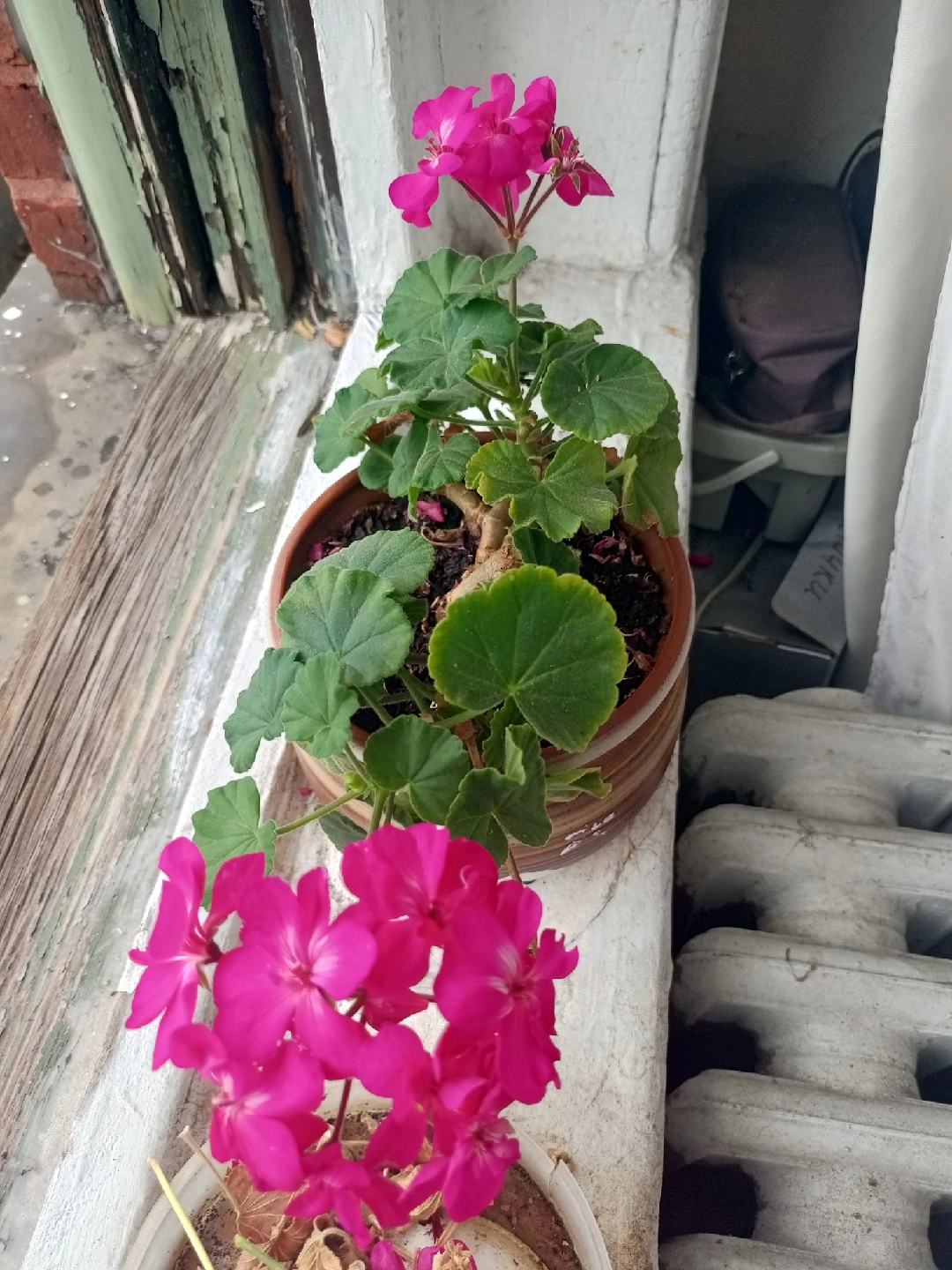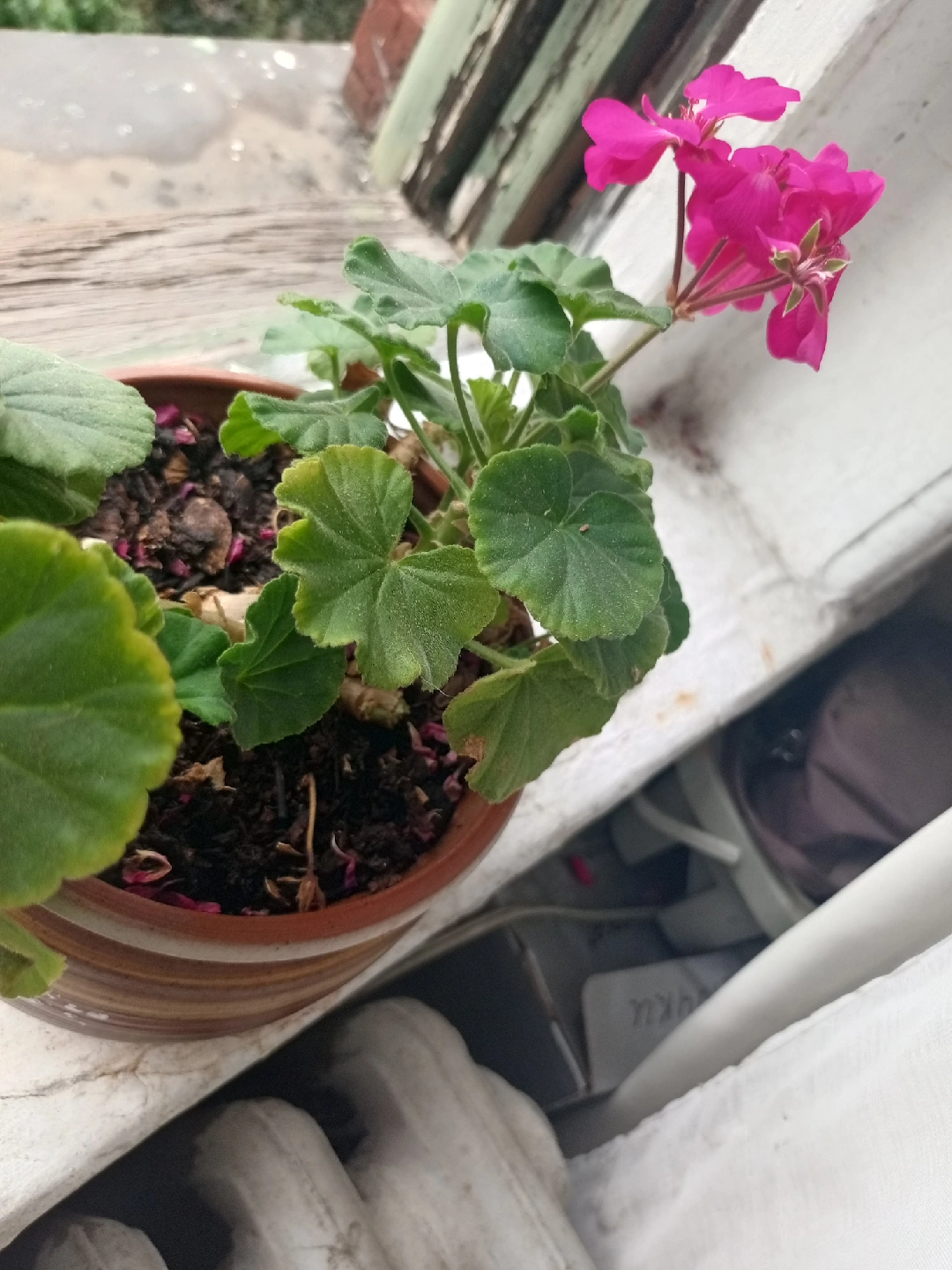 Healthy geranium plant in a black pot, approximately 8 inches tall.