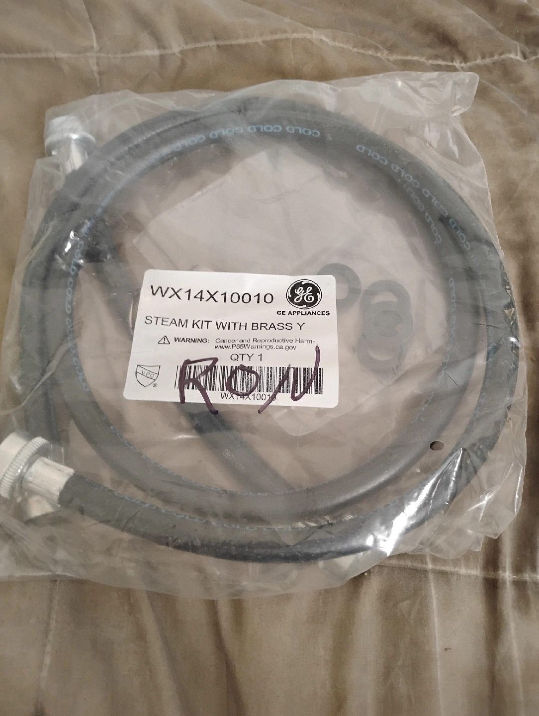 I'm selling a GE Appliances steam kit with brass Y, model number WX14X10010. It is still sealed in the original packaging.