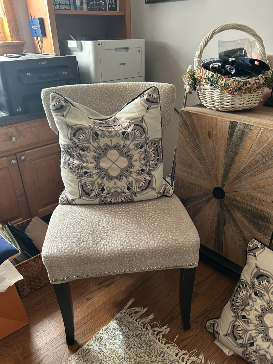 Selling a lovely upholstered dining chair! It features a neutral color with a subtle pattern and stylish nailhead trim. The chair is in great condition and would be a perfect addition to your space. I used it for an office chair. Very comfortable
