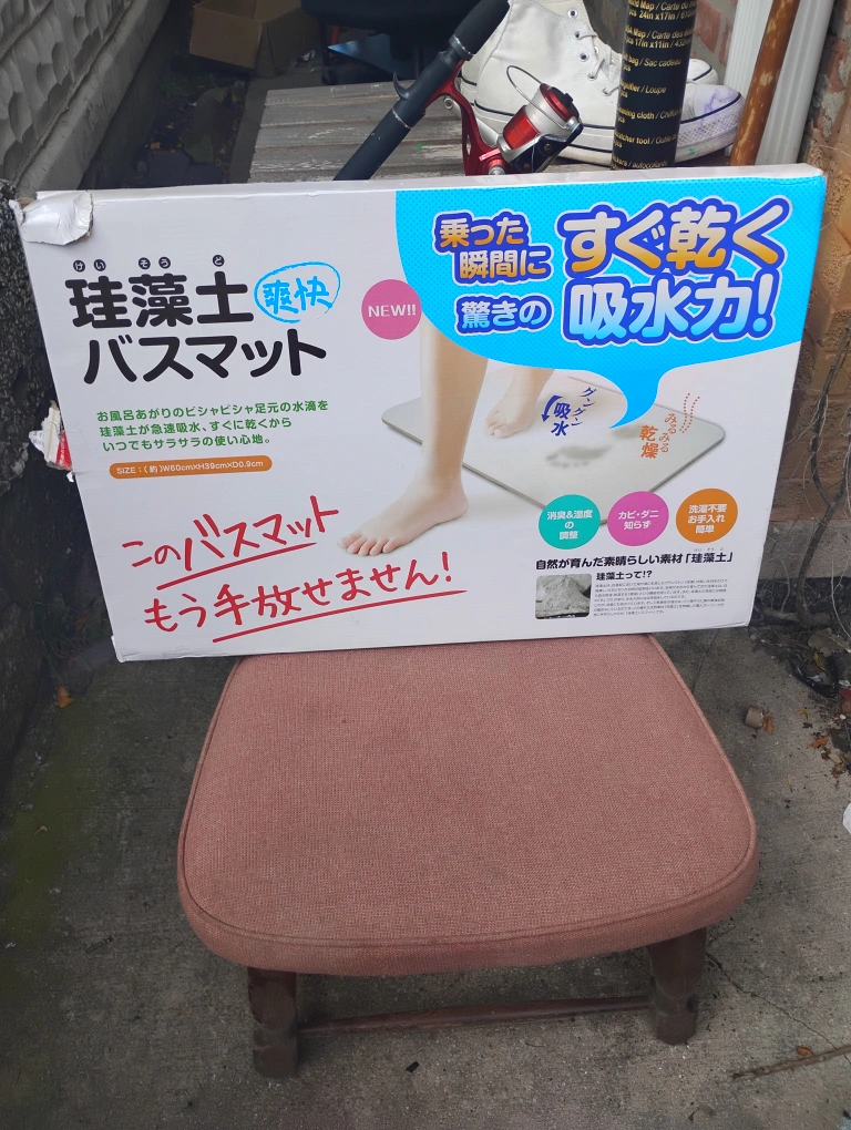 I'm selling a diatomite bath mat! It's designed to quickly absorb water and dry fast, keeping your feet feeling fresh after a bath. The size is approximately W60cm x H39cm x D0.9cm. It also helps with deodorization and humidity control, and is easy to care for since it doesn't need washing