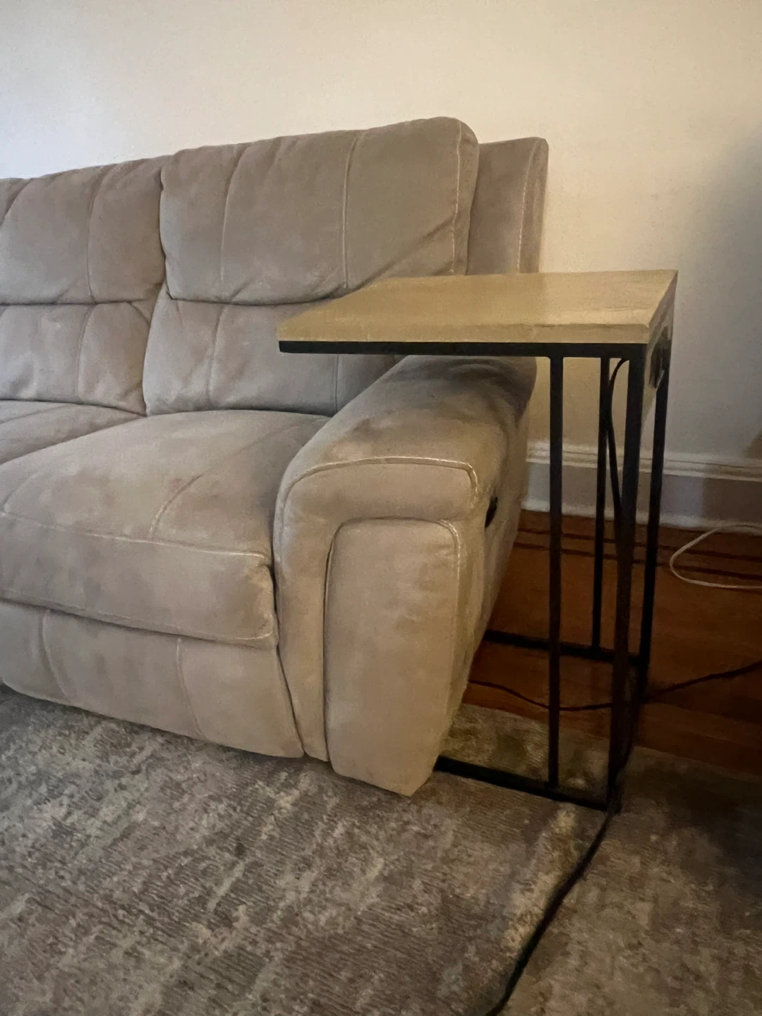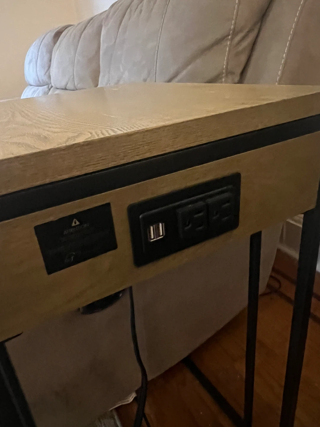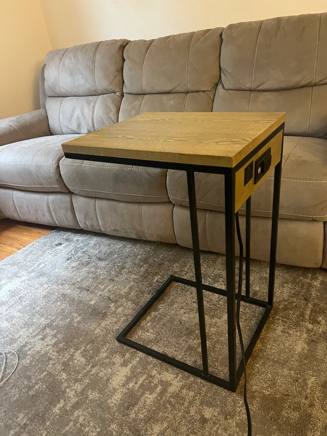 60This end table is perfect for small spaces and has the added convenience of built-in USB ports and outlets! The table has a light wood-look top with a black metal frame. It's great for keeping your devices charged and ready to go while you relax