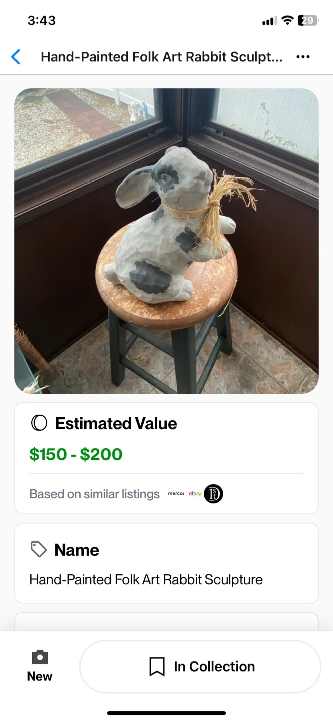 Selling a hand-painted folk art rabbit sculpture. It's a charming piece with an estimated value between $150 and $200, based on similar listings. Perfect for adding a touch of folk art to your home