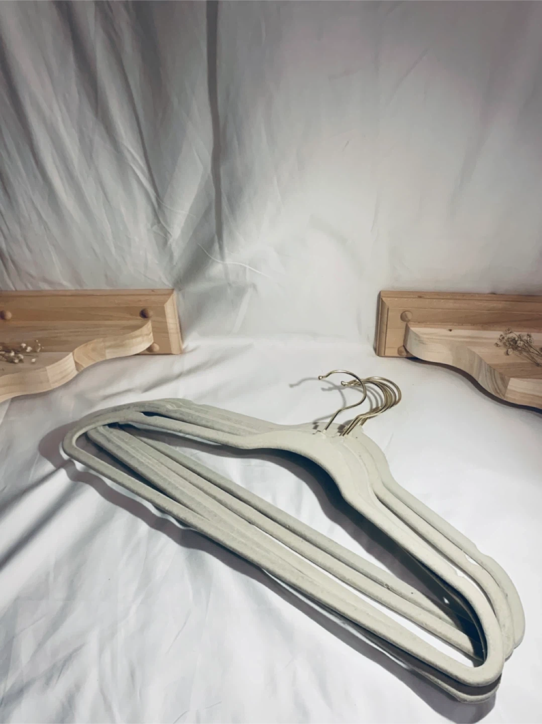 Set of 6 slim felt hangers with gold metal hooks. The felt coating helps prevent clothes from slipping, while the slim design saves closet space. • Set of 6 hangers • Material: felted coating with metal hooks • Neutral beige color with gold hooks • Pre-owned, lightly used