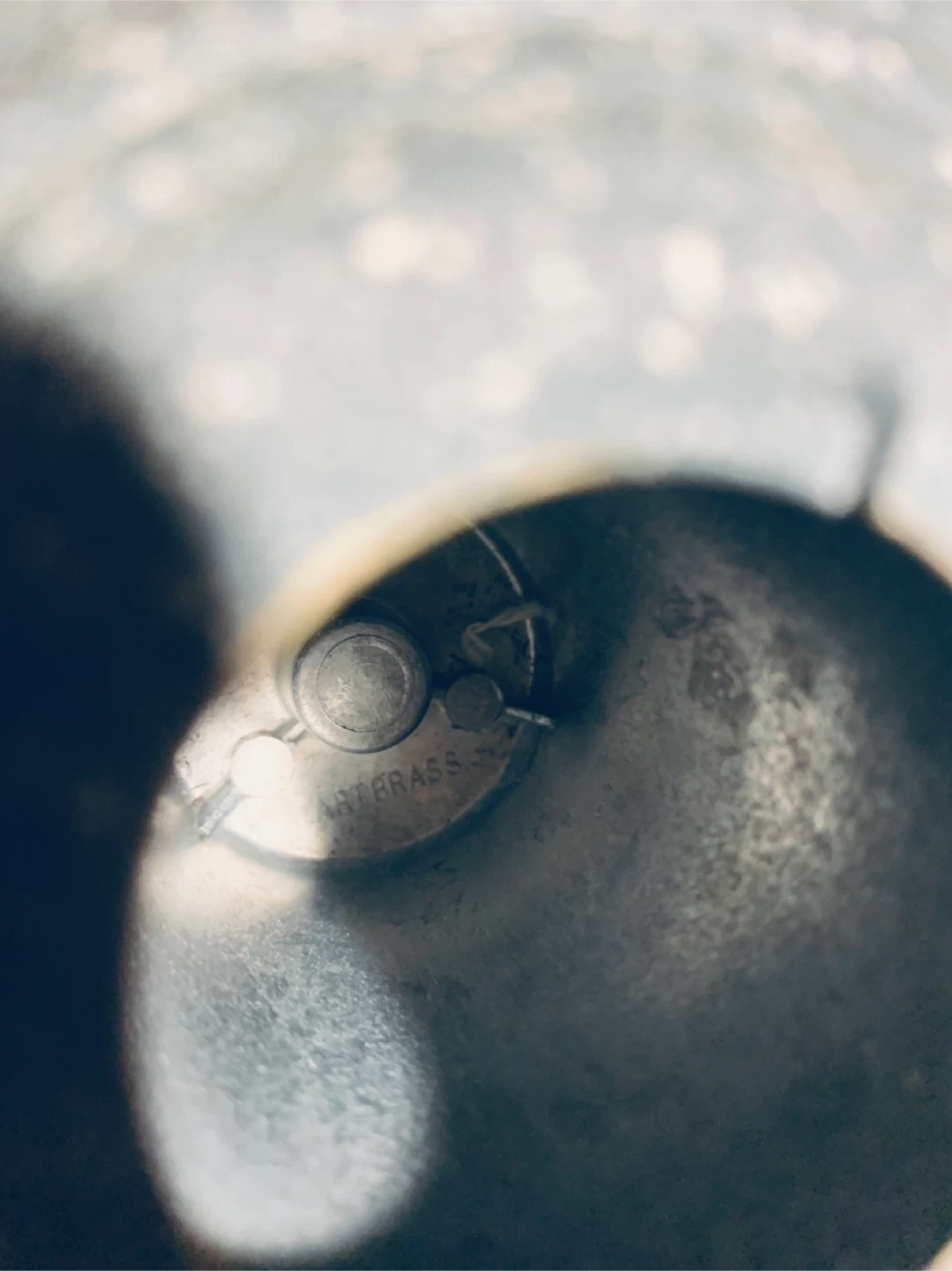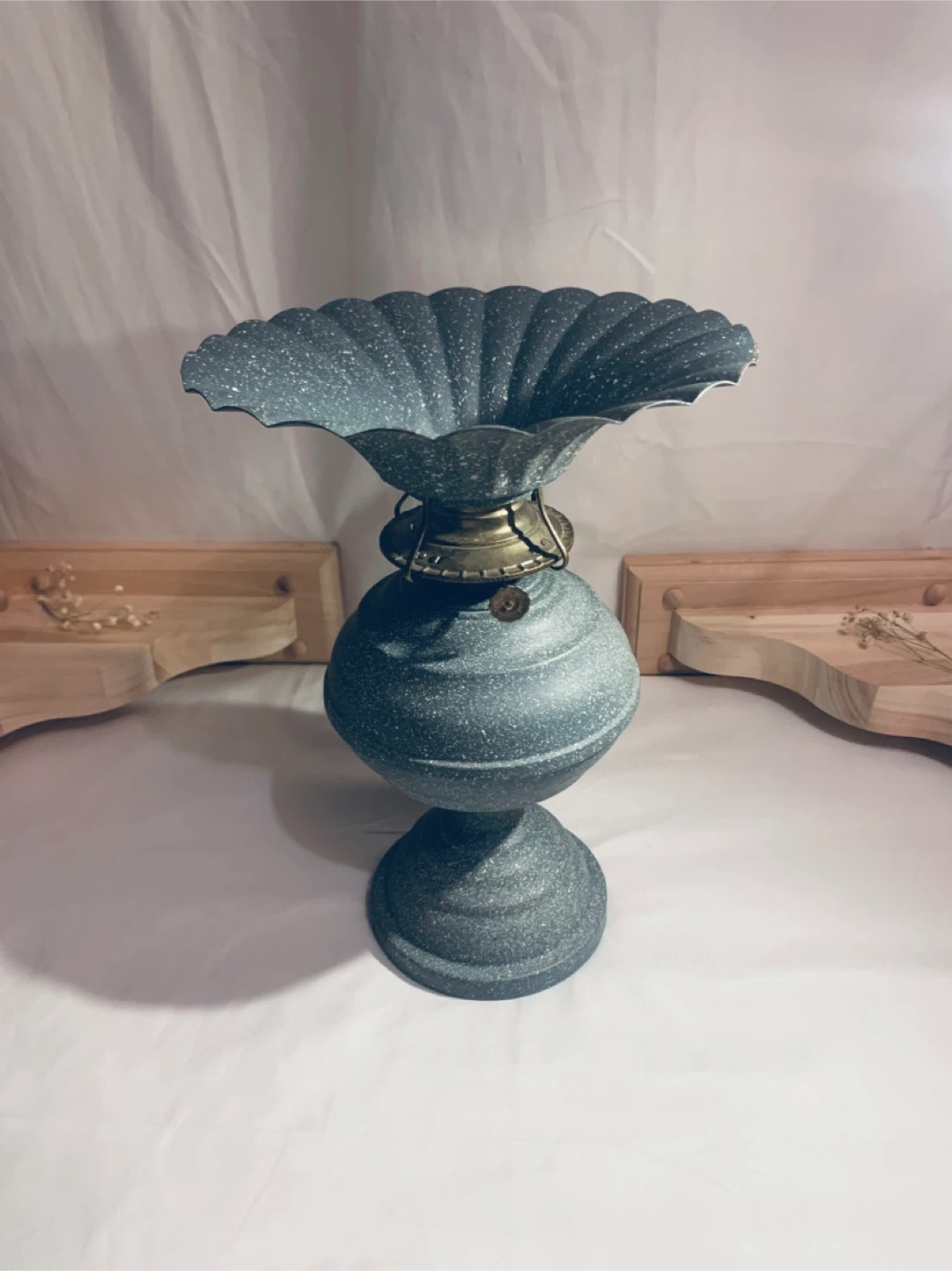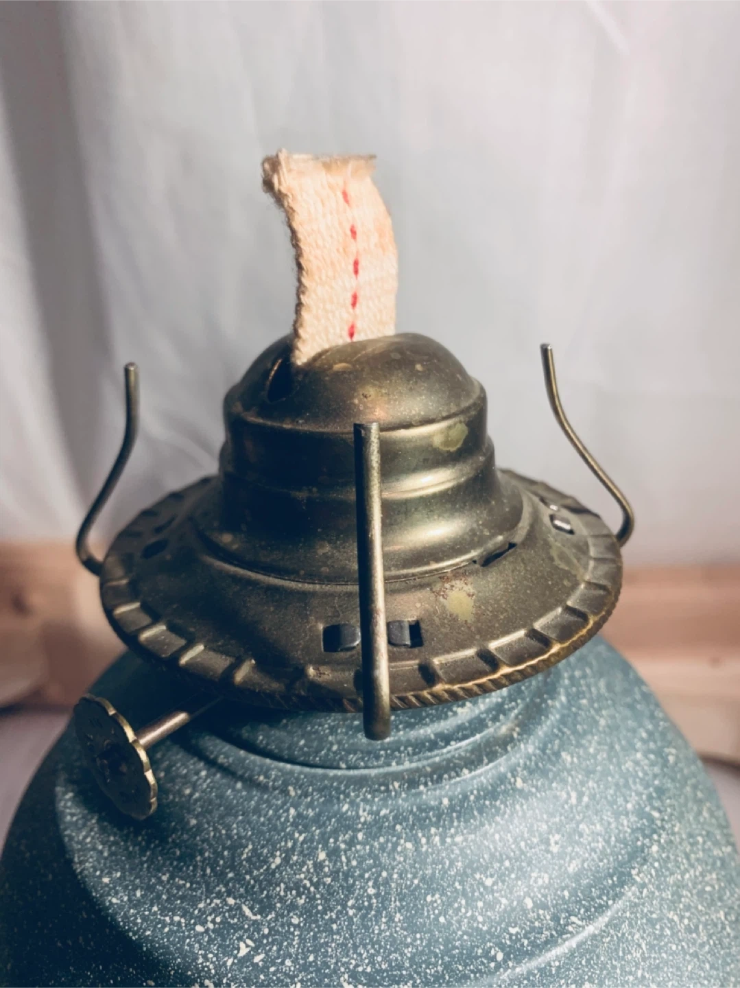 Unique vintage oil lantern with enamel body and brass fittings. Features a scalloped top and original cotton wick mechanism. Stamped “ANT BRASS” on the inside, confirming authentic brass construction. A statement piece for collectors or for rustic interior design. Condition: Pre-loved, good vintage condition with light wear consistent with age. Dimensions: ~12–14” tall Color: Speckled blue enamel with brass accents