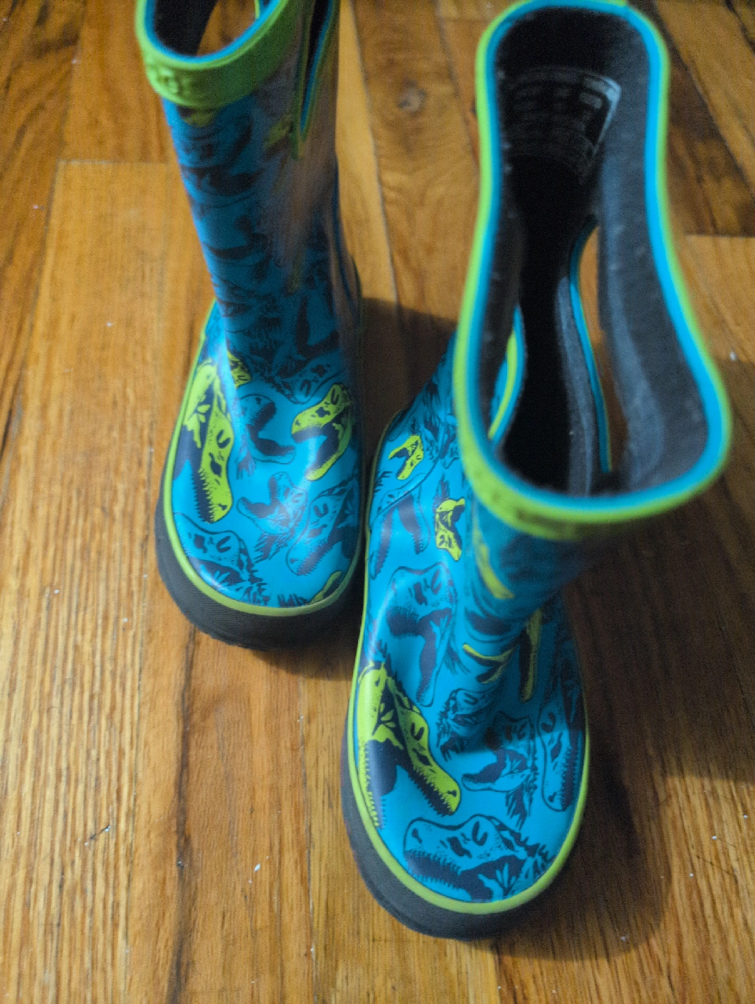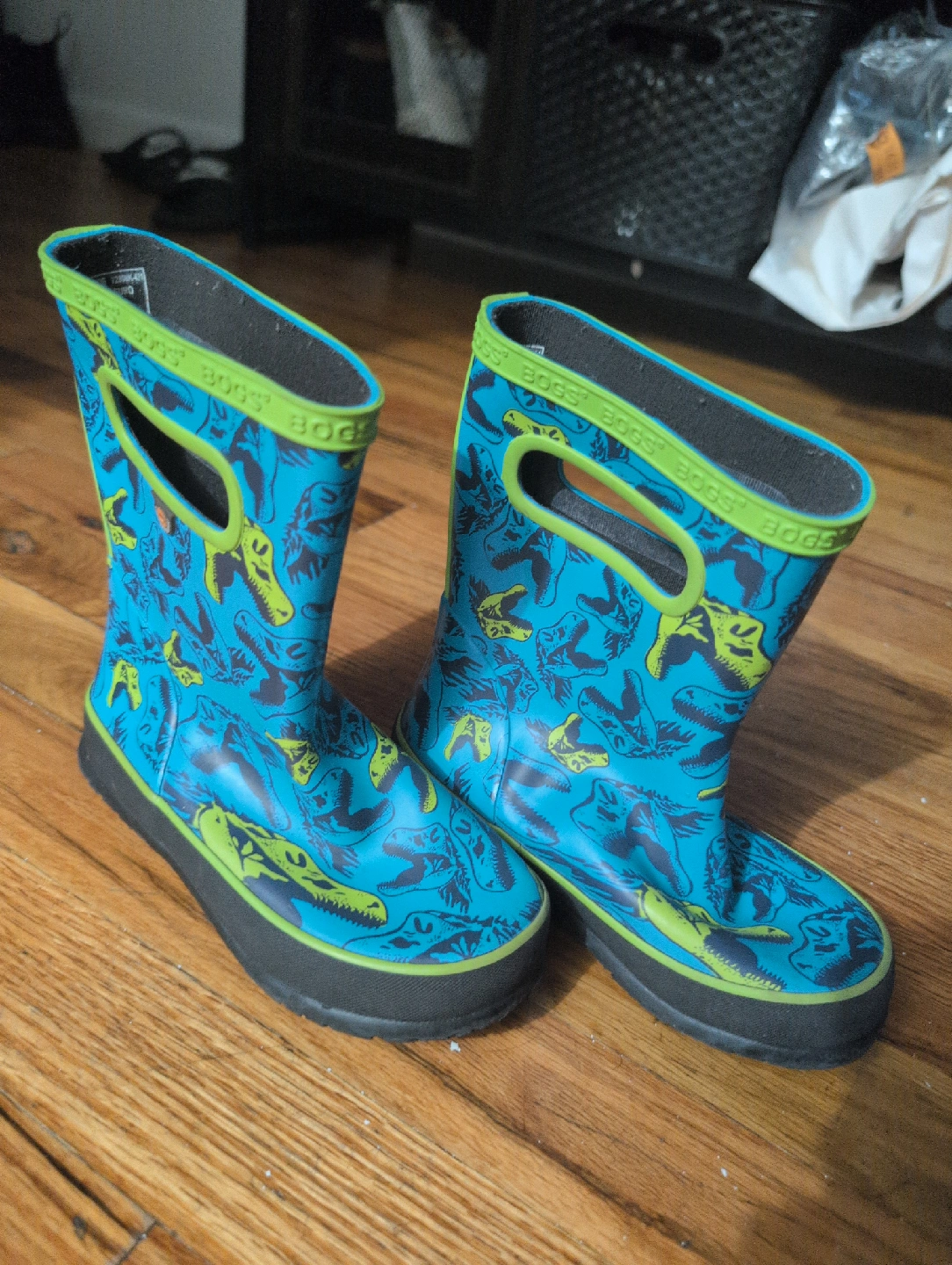 These Bogs kids' rain boots are a size 10 and feature a fun dinosaur print! They are perfect for keeping little feet dry on rainy days
