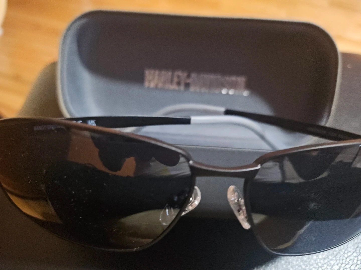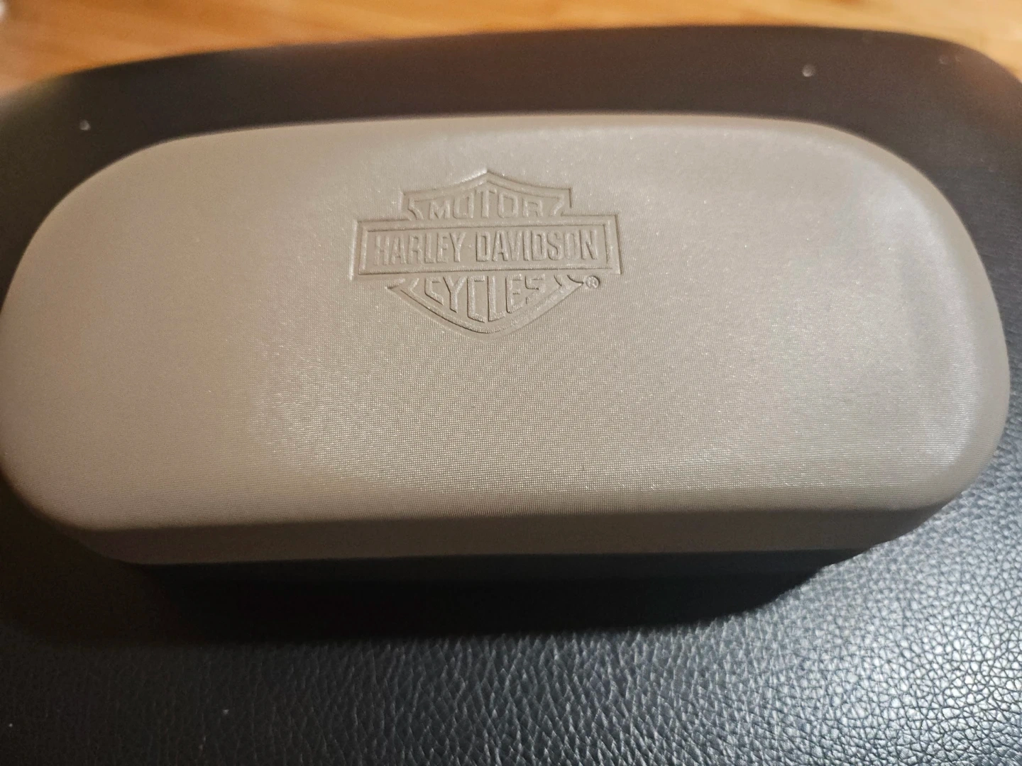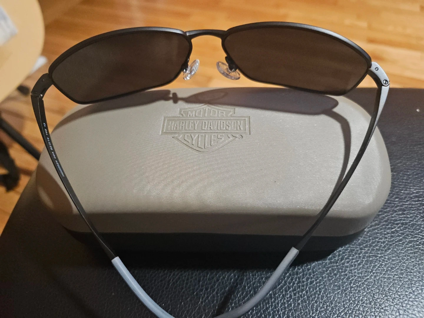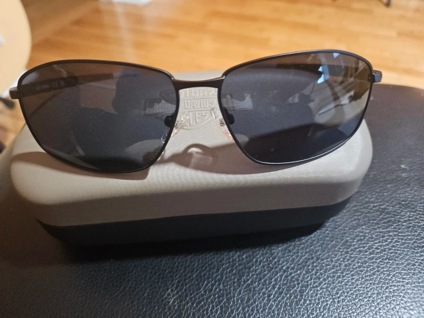 These are Harley-Davidson sunglasses with a protective case. The sunglasses have dark lenses and a metal frame. Includes the original branded case for storage.