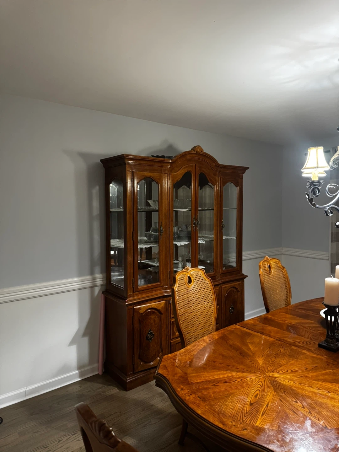 This large wooden china cabinet features glass doors for display. It has multiple shelves inside for storage. It's a beautiful piece for a dining room!
