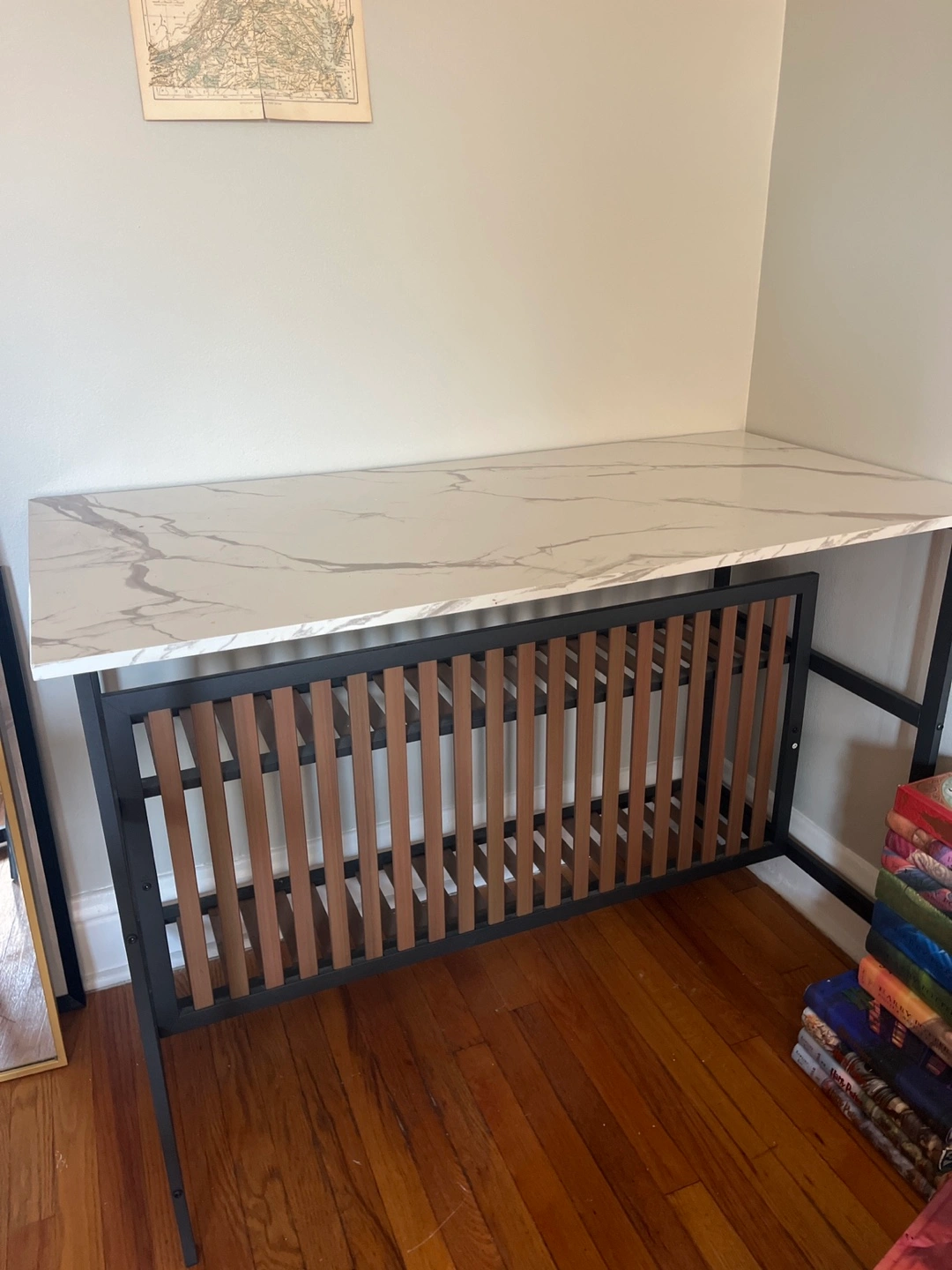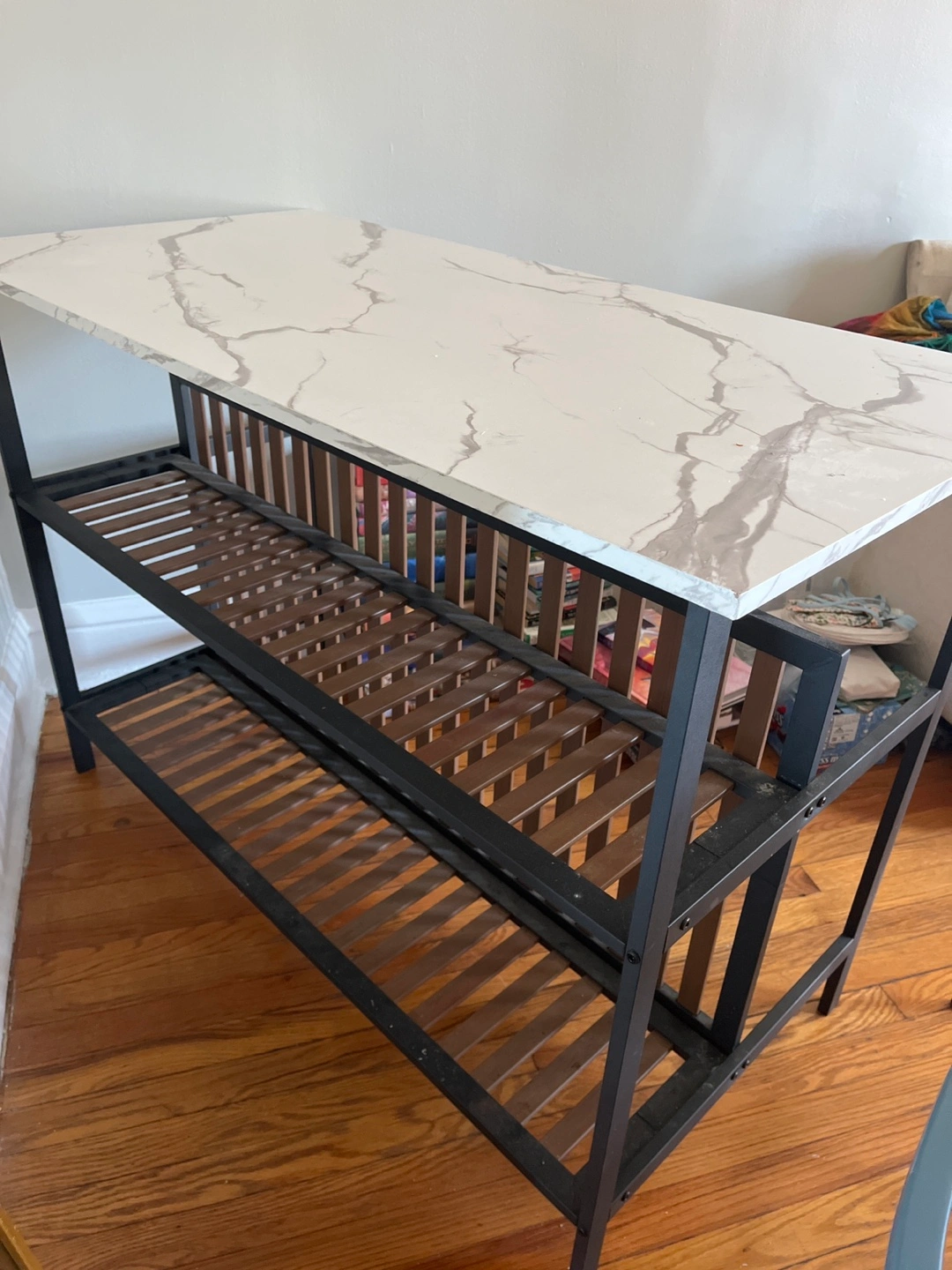Selling kitchen island/counter! It has two shelves with a slat design, perfect for storage or display. There is room for stools on the other side. Perfect to add more counter space and storage!