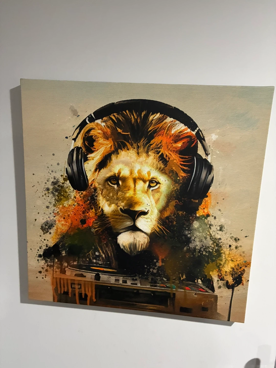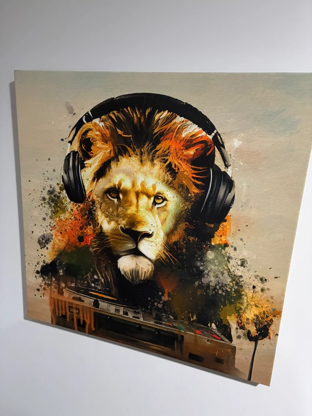 Canvas wall art featuring a lion DJ with headphones and a turntable.