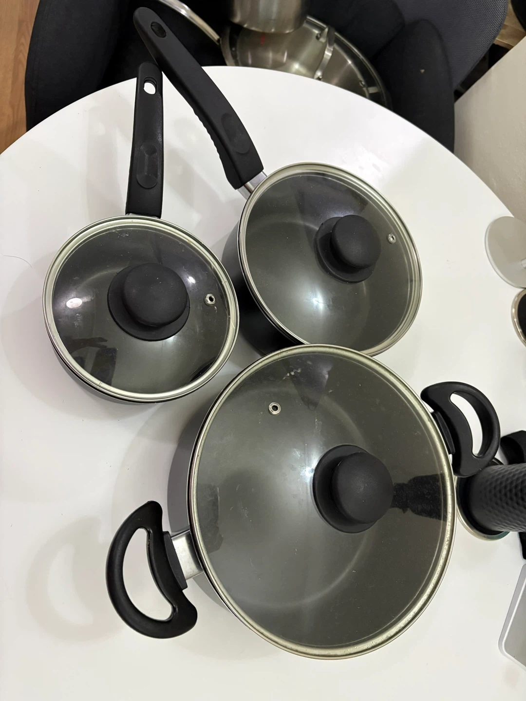 Selling a set of pots and pans. The set includes a small saucepan, a medium pot, and a larger pot, all with glass lids. They're in good condition and ready for a new home