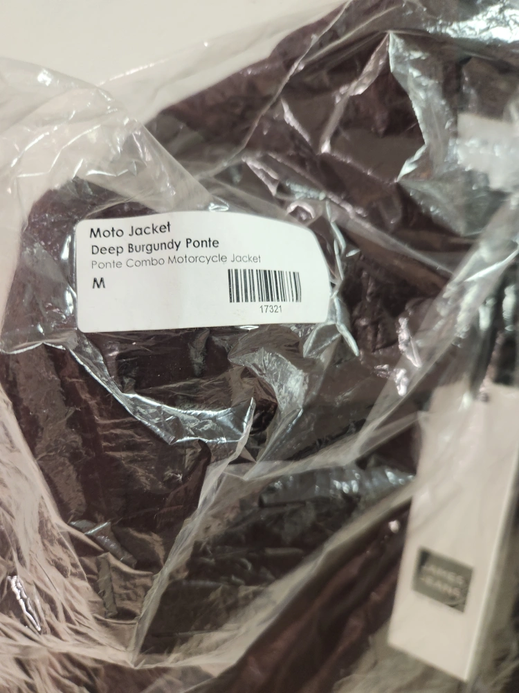 Selling a James Jeans Moto Jacket in a deep burgundy ponte combo. It's a size medium and has a stylish motorcycle jacket design. Great for adding a bit of edge to your wardrobe!