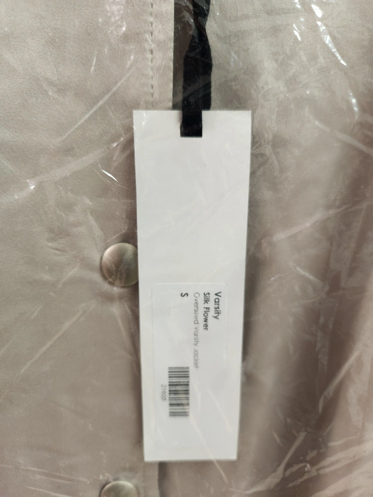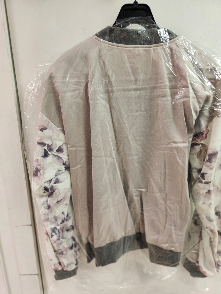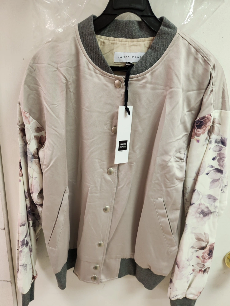 Selling a James Jeans Varsity Silk Flower Oversized Jacket in size S. The jacket features a beautiful floral pattern on the sleeves and a stylish, oversized fit. It's perfect for adding a touch of elegance to your wardrobe!