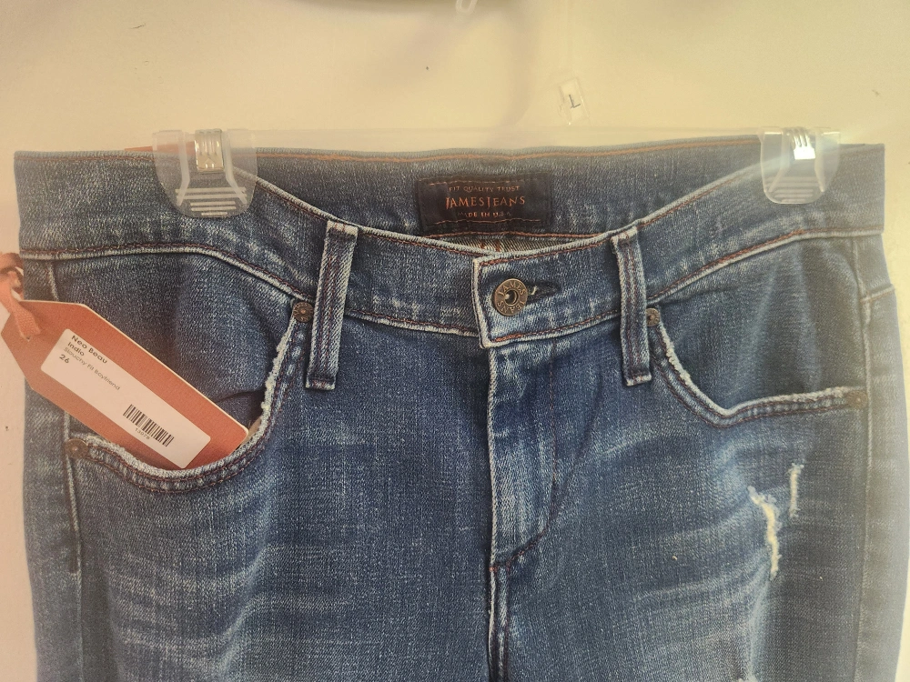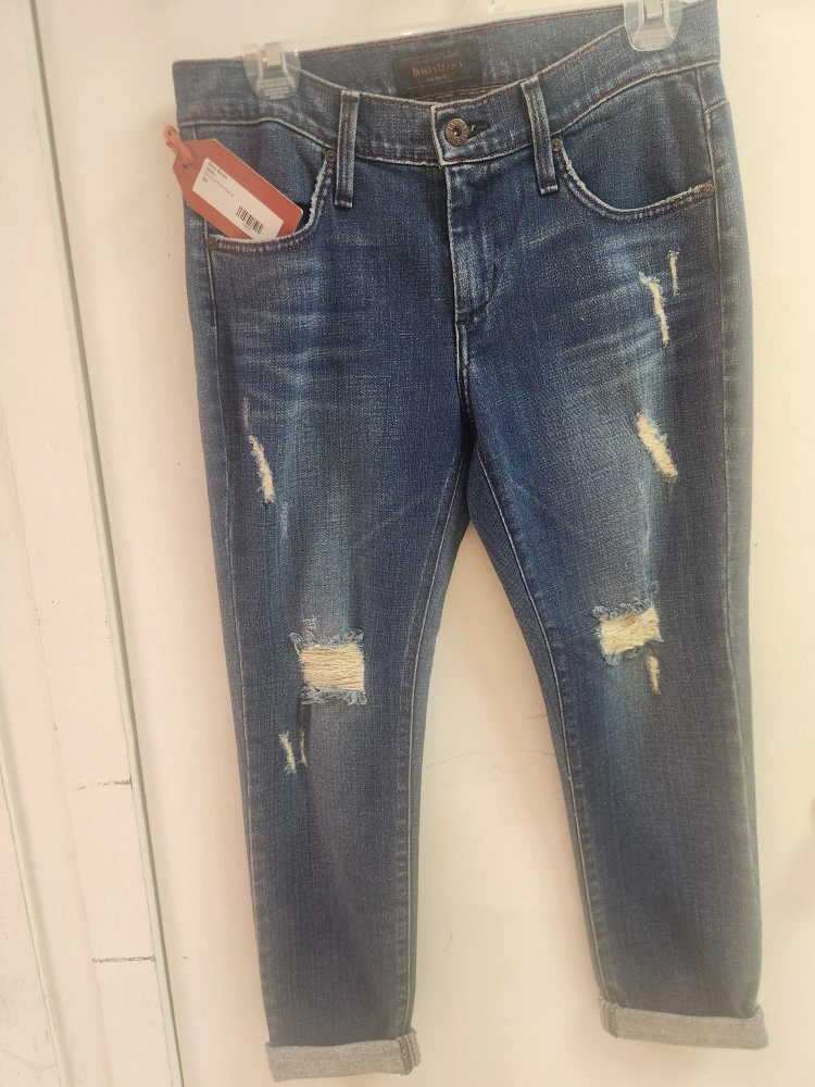 These are James Jeans, specifically the New Beau Boyfriend style in size 26! They have a distressed look and are new