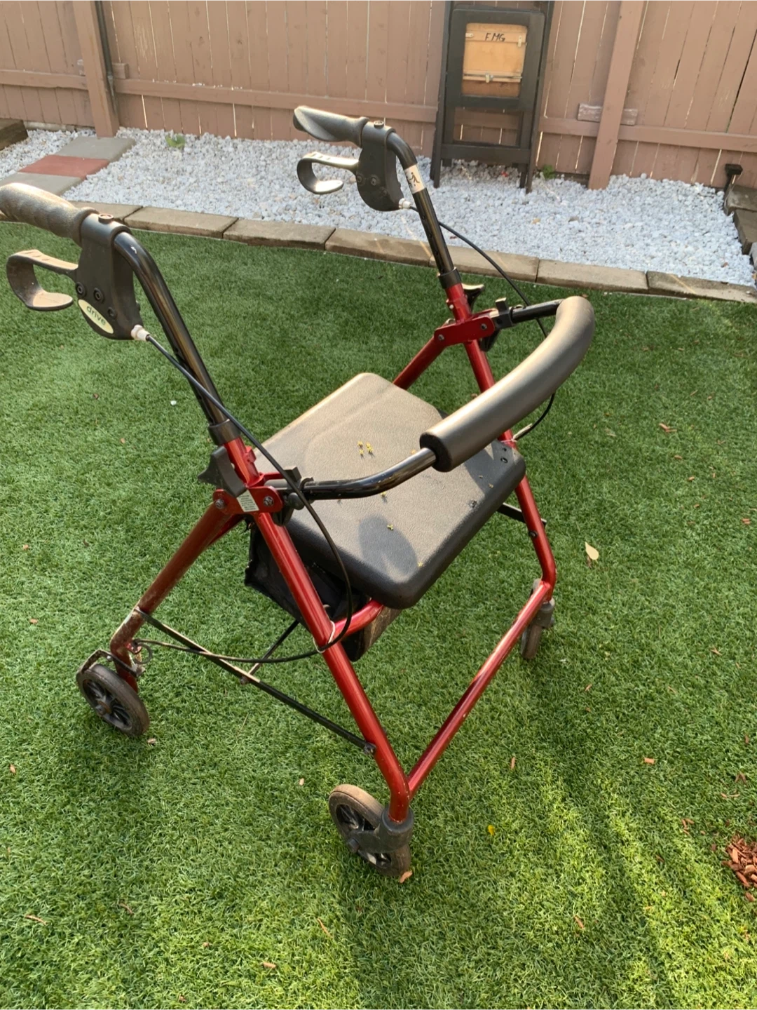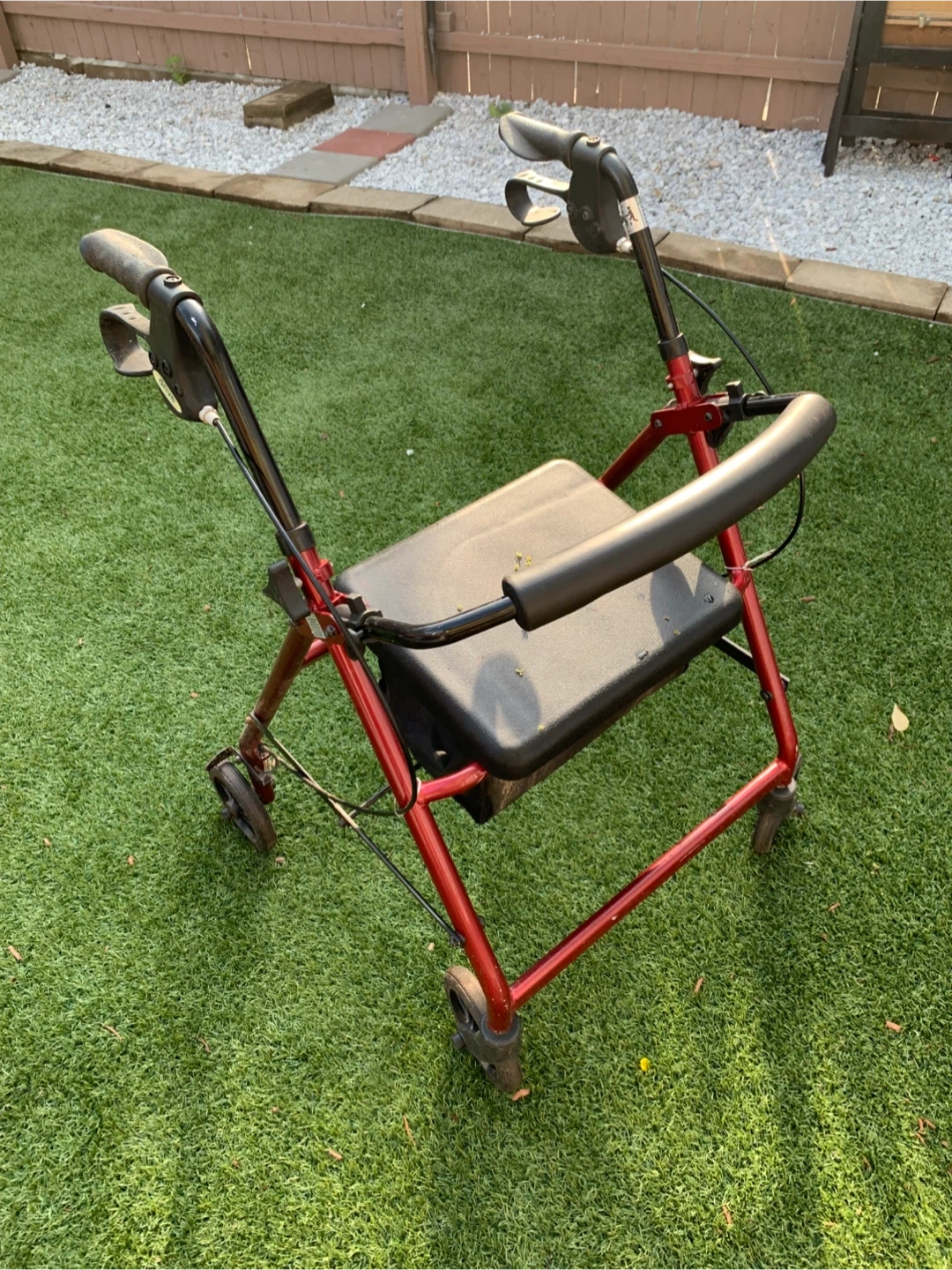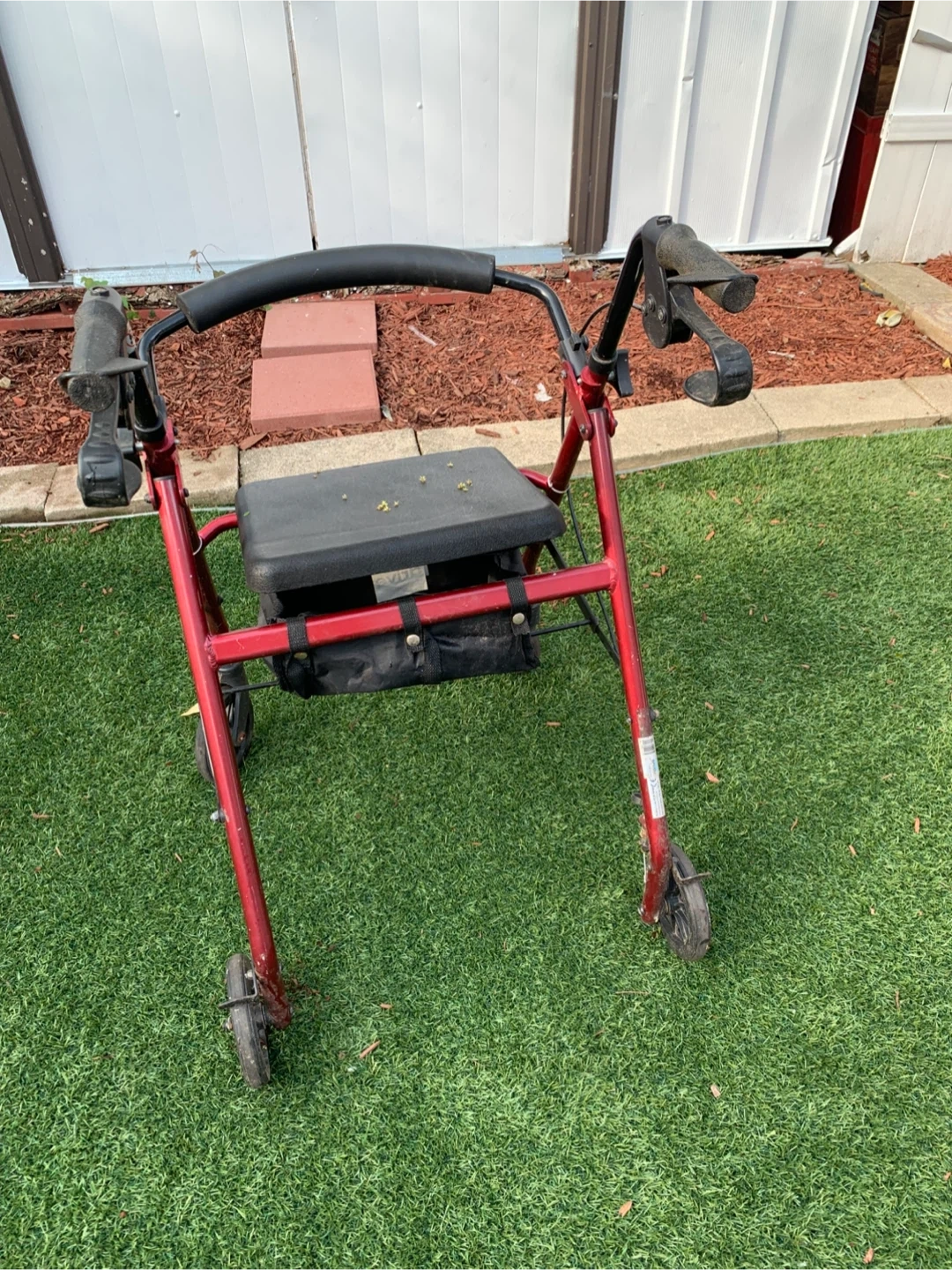Selling a red folding walker with a built-in seat. It's in good condition and ready to use! Great for anyone needing a little extra support and a place to rest on the go
