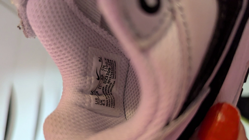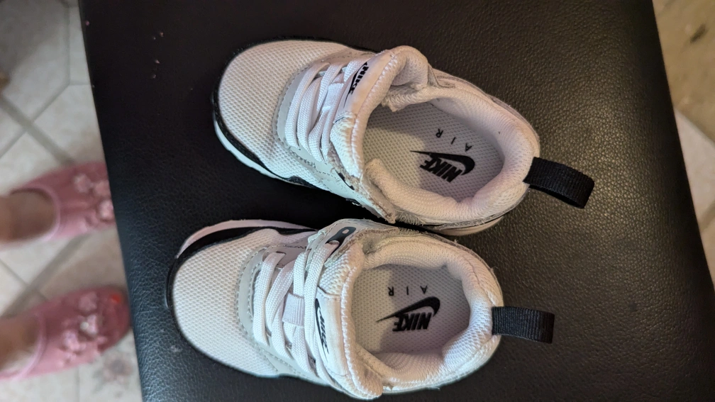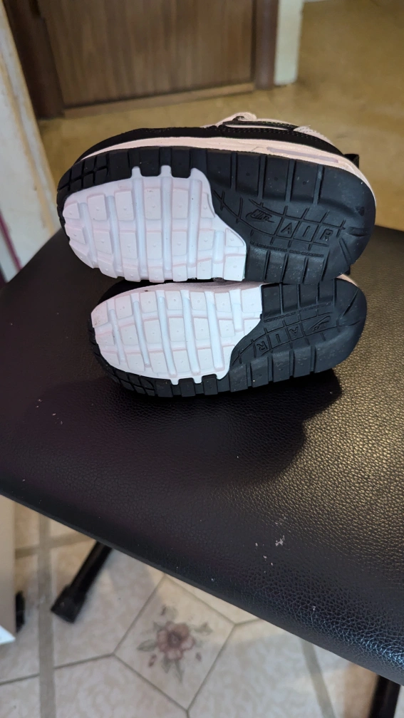 These are a pair of Nike Air Max 1 toddler shoes in size 5C! They feature a white, gray, and black color scheme with the classic Air Max design. Perfect for your little one's first steps!