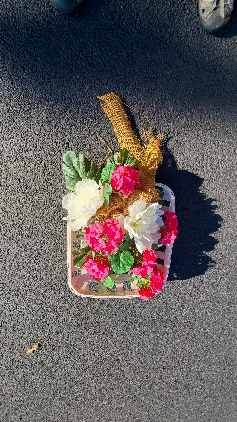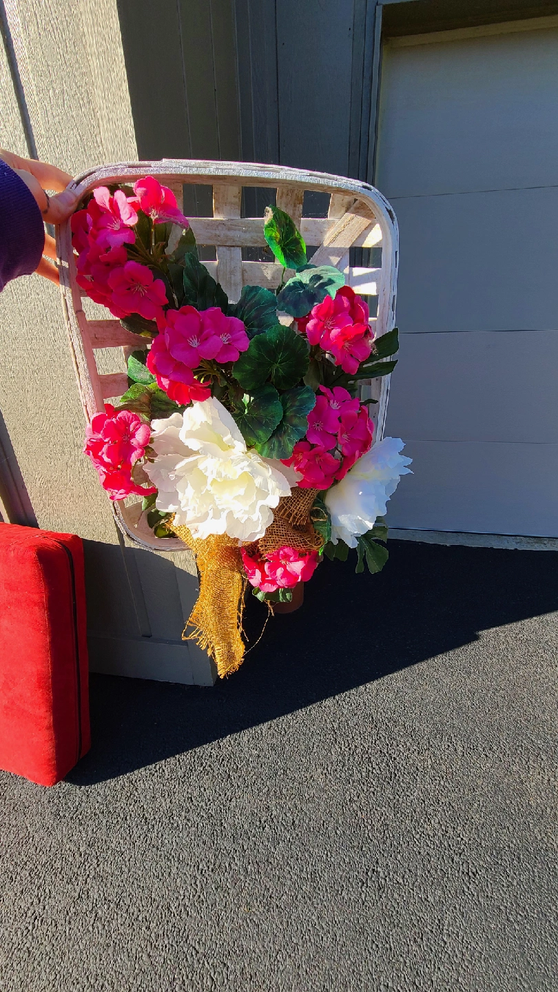 This floral basket wall decor is a charming addition to any home. It features a mix of pink and white flowers arranged in a white basket. The burlap ribbon adds a rustic touch. Perfect for adding a touch of spring to your space! handmade