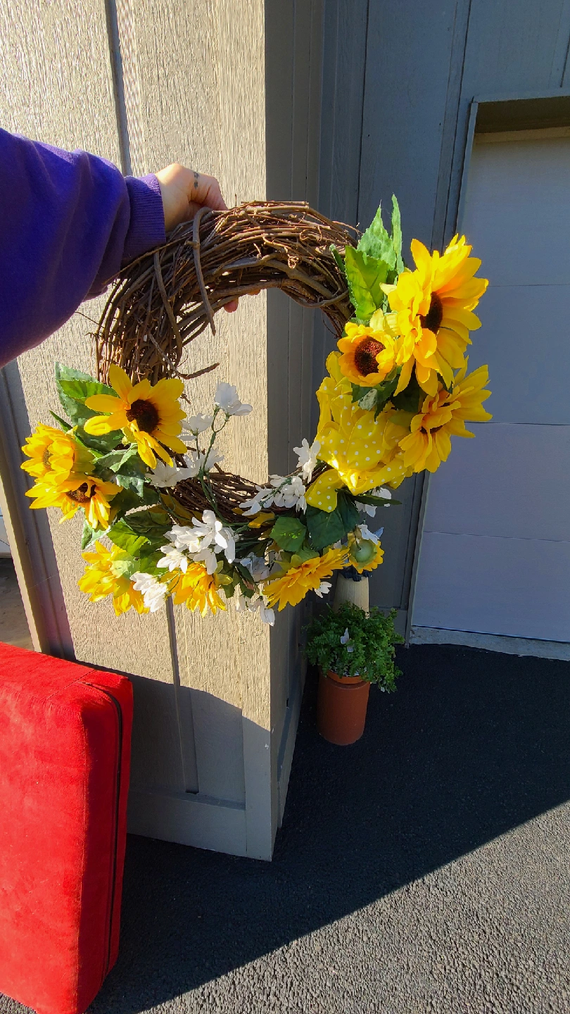 Selling a beautiful sunflower wreath, perfect for adding a touch of sunshine to your home! It features bright yellow sunflowers and delicate white flowers arranged on a natural grapevine base. It's in great condition and ready to brighten up your space. handmade