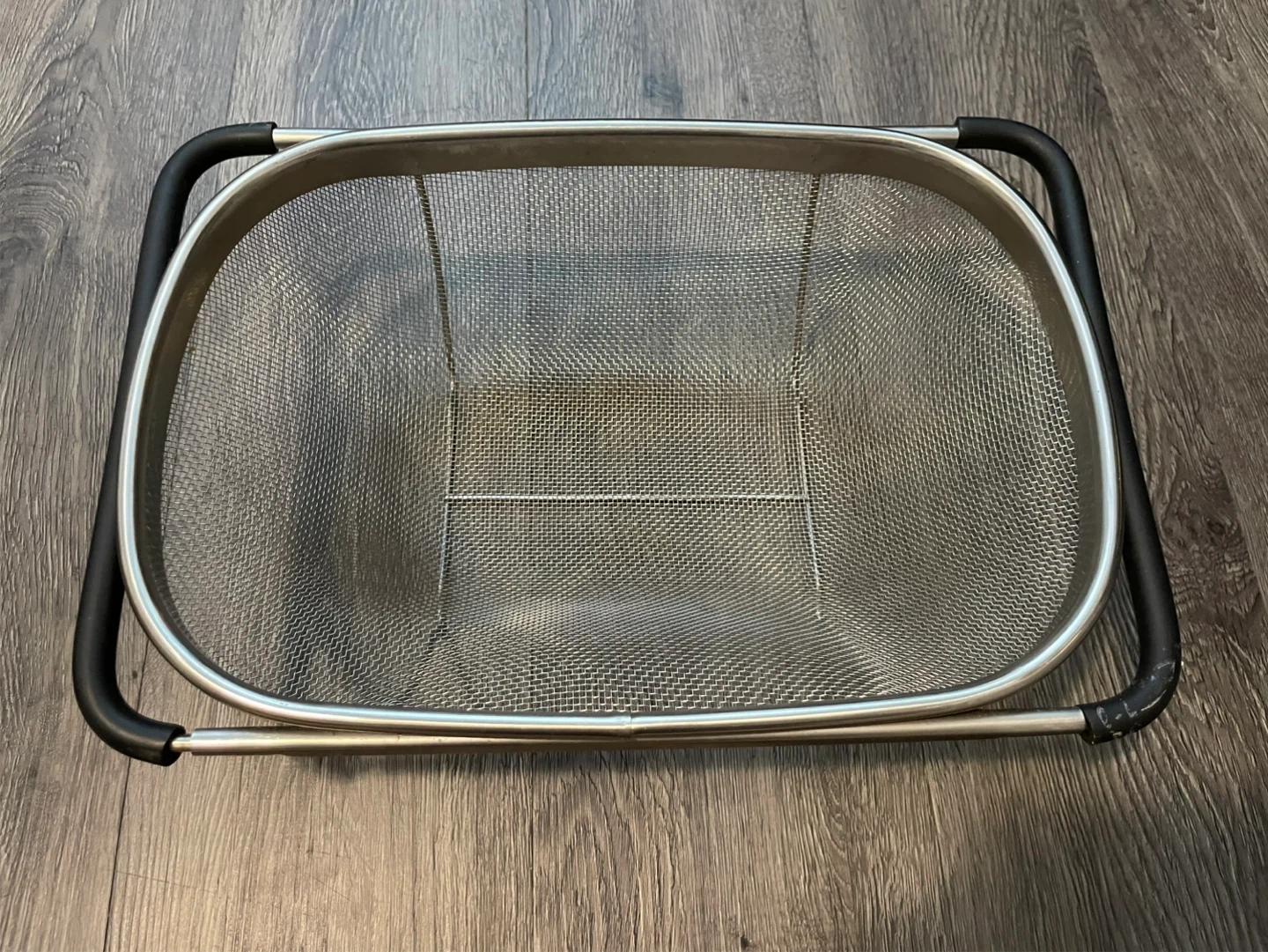 Here's an adjustable over-the-sink colander. It's in great condition and ready to use for washing fruits, vegetables, or straining pasta! It has a mesh basket for easy draining and adjustable arms to fit over your sink
