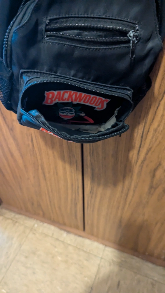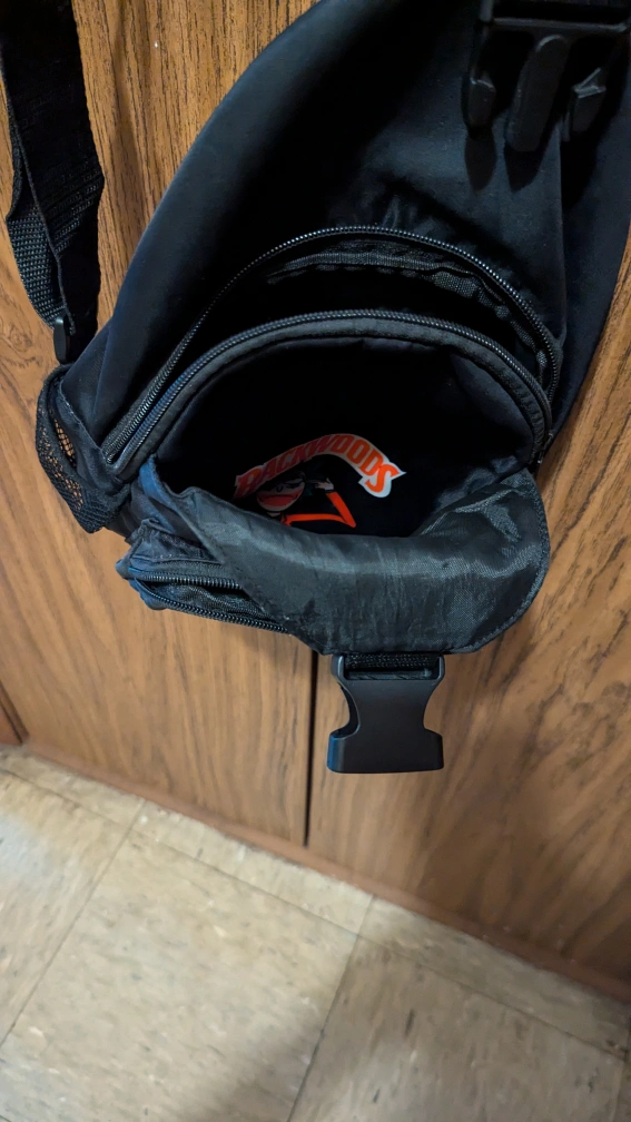 Black sling bag with Backwoods design. Great for carrying essentials!