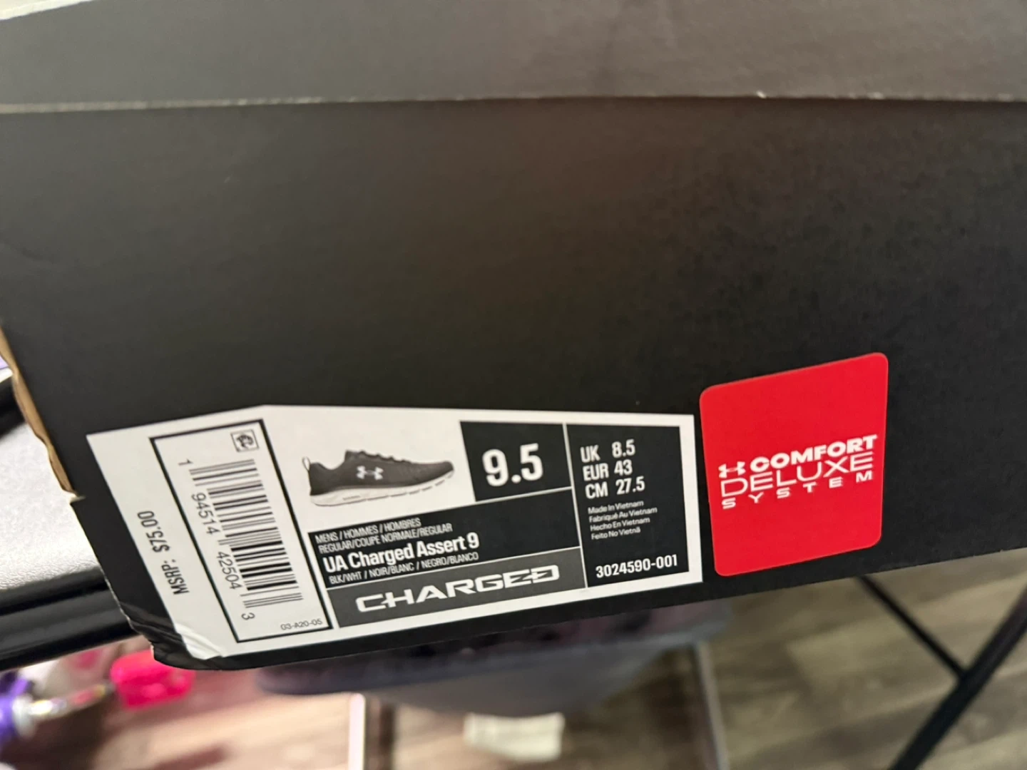 Selling a pair of Under Armour Charged Assert 9 men's running shoes in size 9.5 US. They are in excellent condition and come with the original box. These shoes feature the Comfort Deluxe System for added comfort and support. The MSRP on the box is $75.00. Great for running or everyday wear!