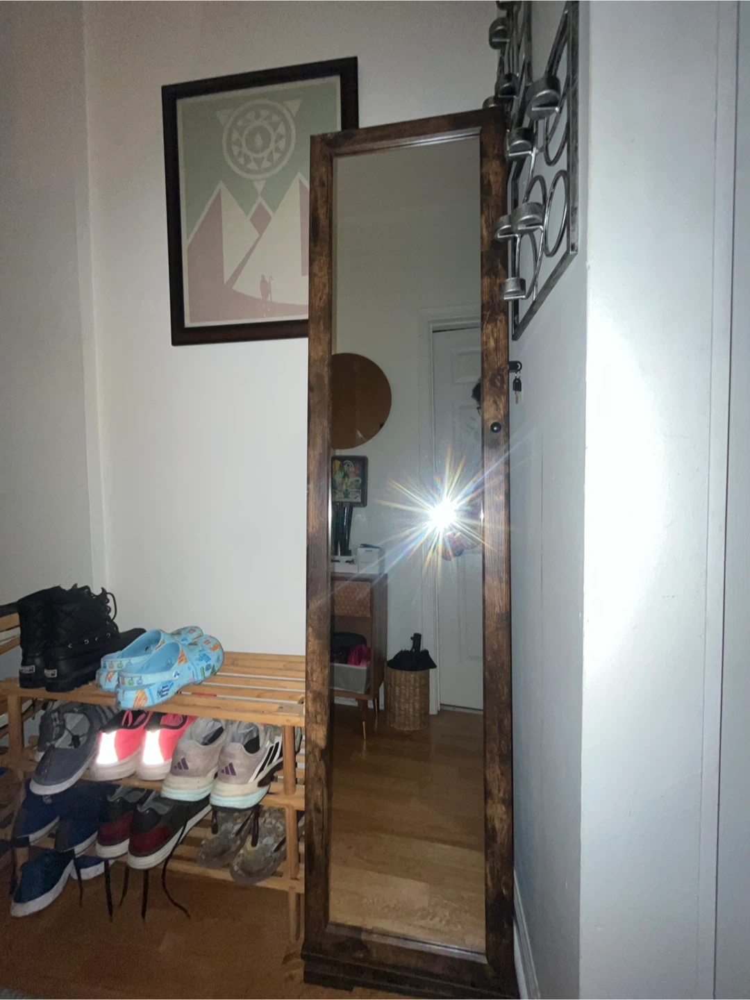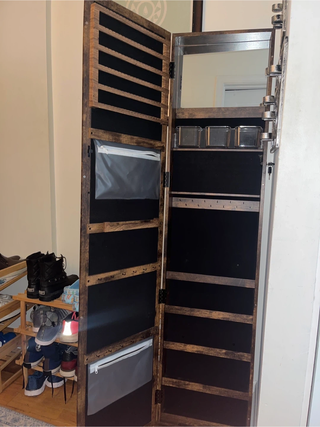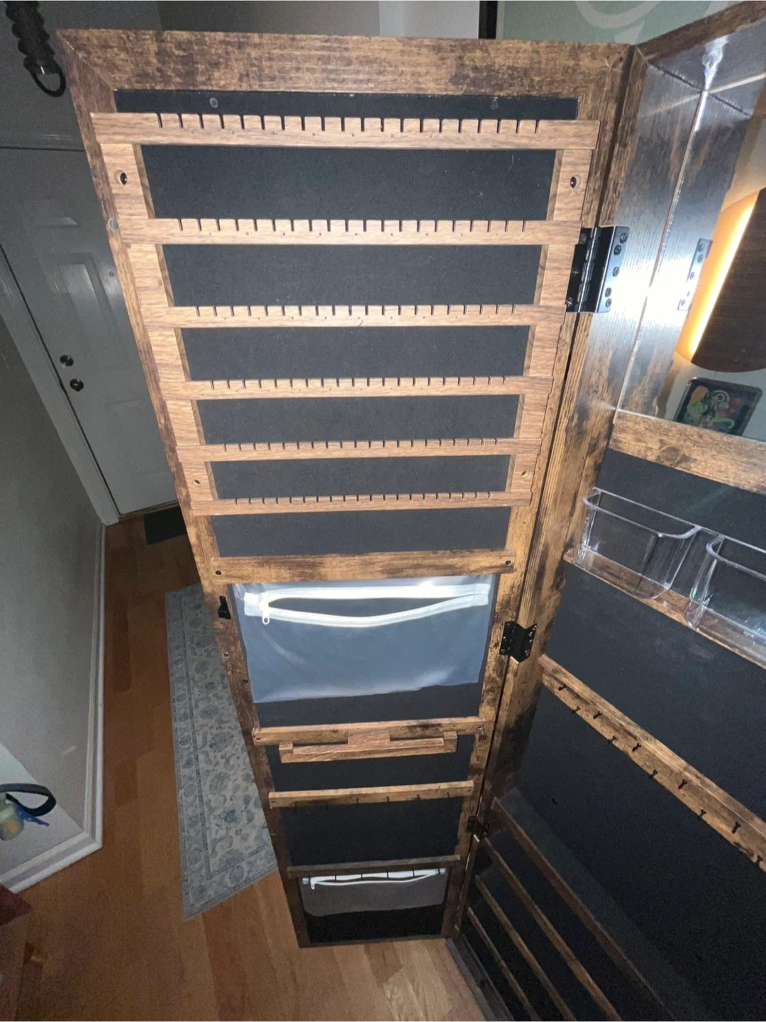 Like-new wooden jewelry armoire with a mirror. It's a cabinet that stands upright and is perfect for storing all your jewelry and accessories. The interior is lined with black felt and has various compartments for earrings, necklaces, and more. It also features a mirror on the door so you can easily see how your jewelry looks on you. 360° Swivel Full-length Mirror. Size