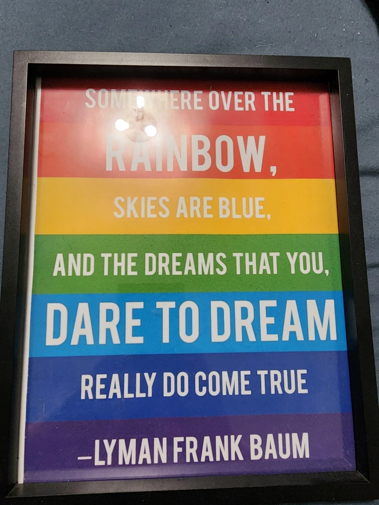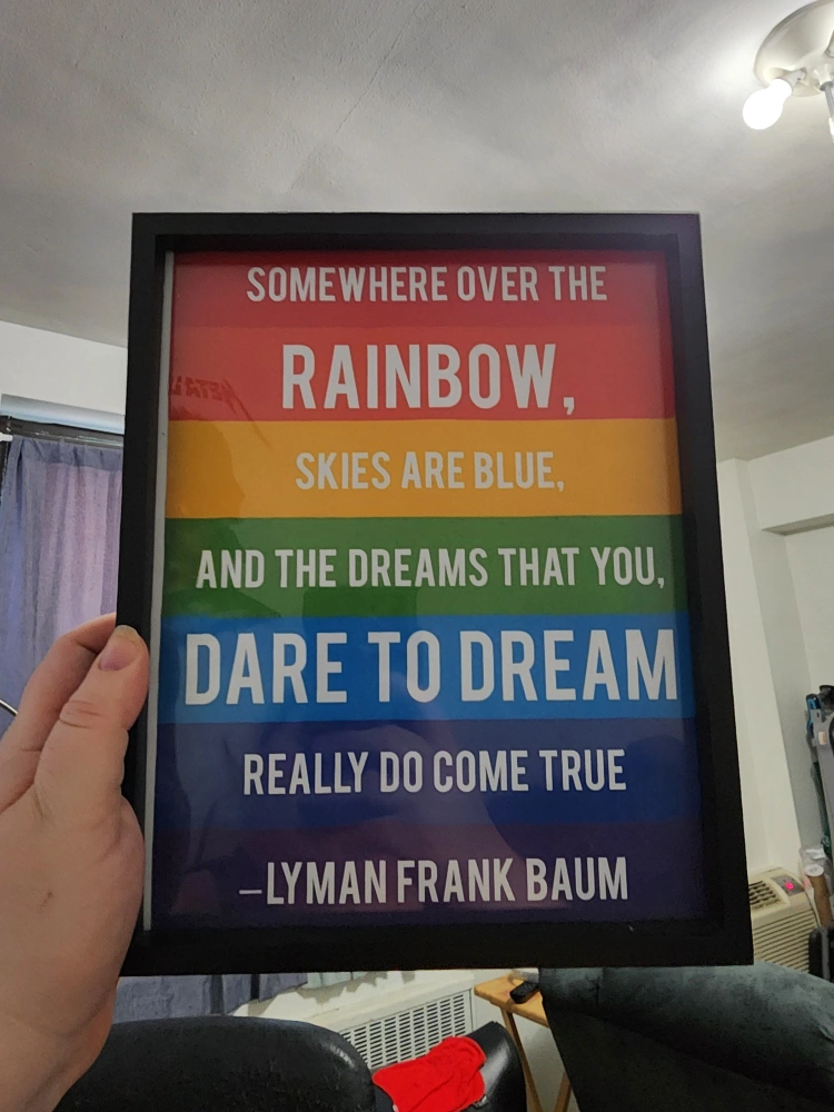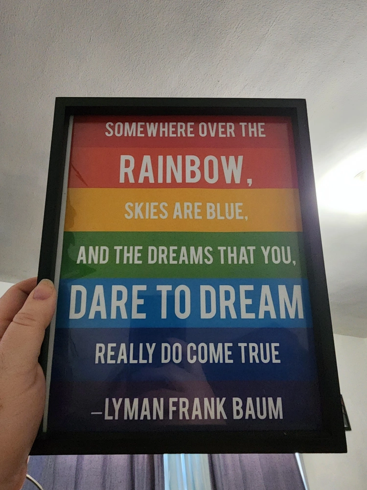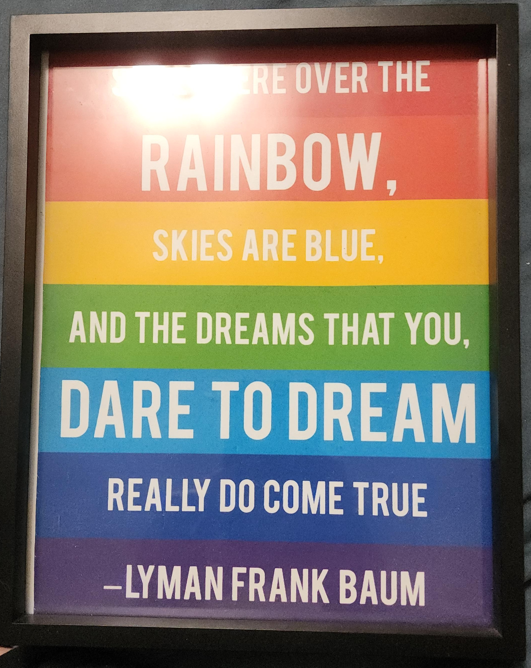 This framed print features the quote "Somewhere Over the Rainbow, Skies Are Blue, And the Dreams That You, Dare to Dream Really Do Come True". It's a colorful and inspiring piece of wall art