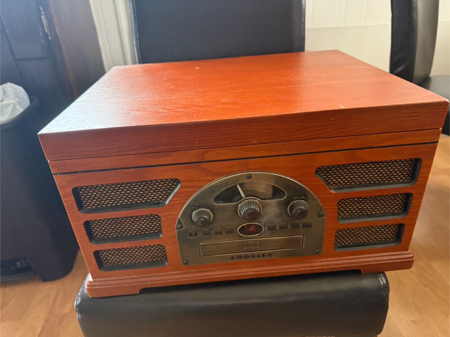 Selling a Crosley turntable record player in good condition! It's a stylish and functional piece for any music lover. The record player is brown and features a vintage-inspired design. It includes the power cord