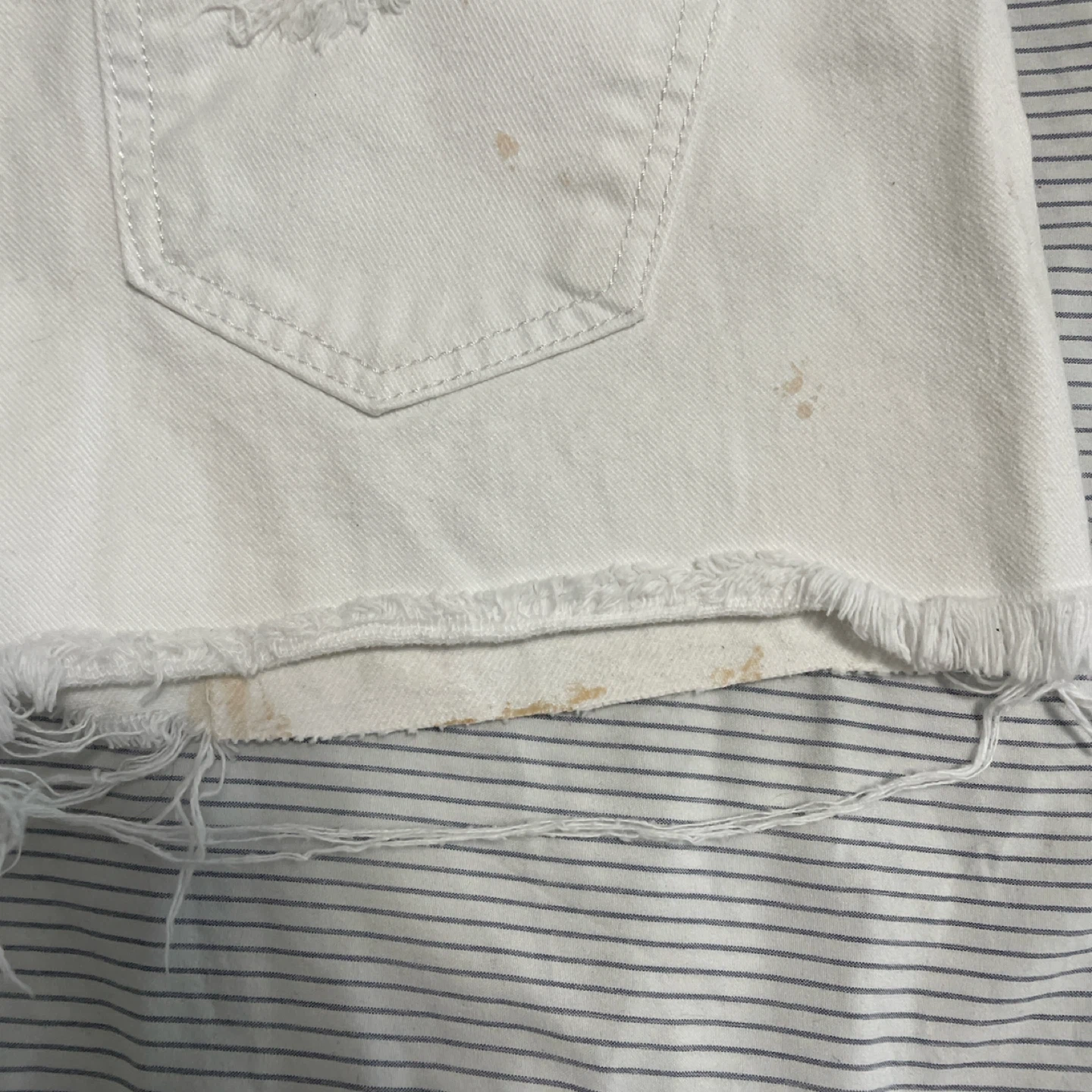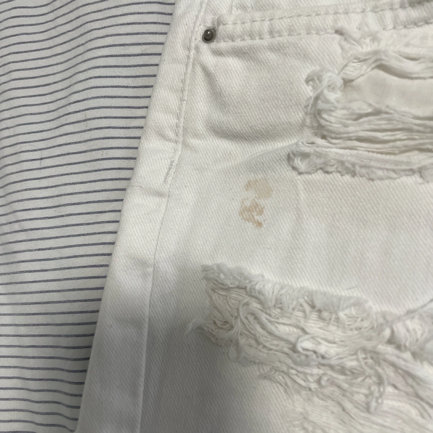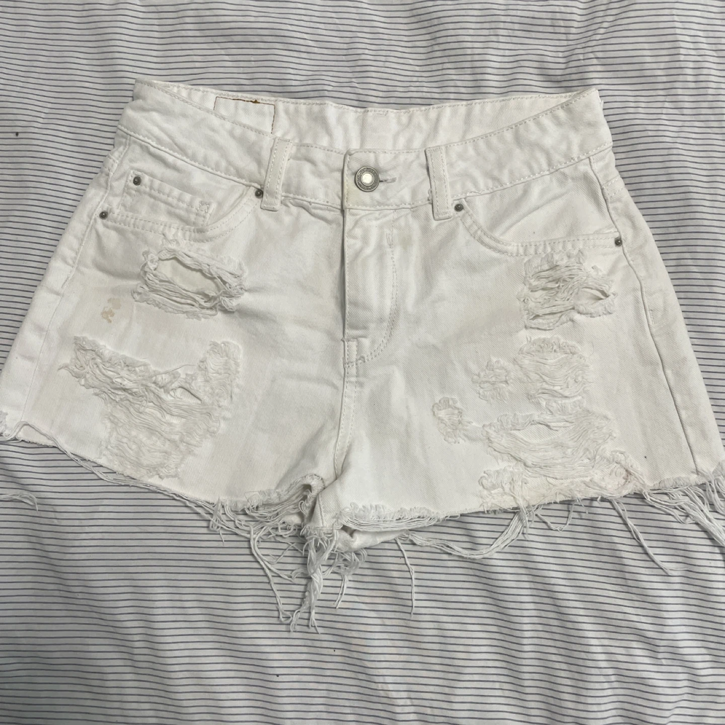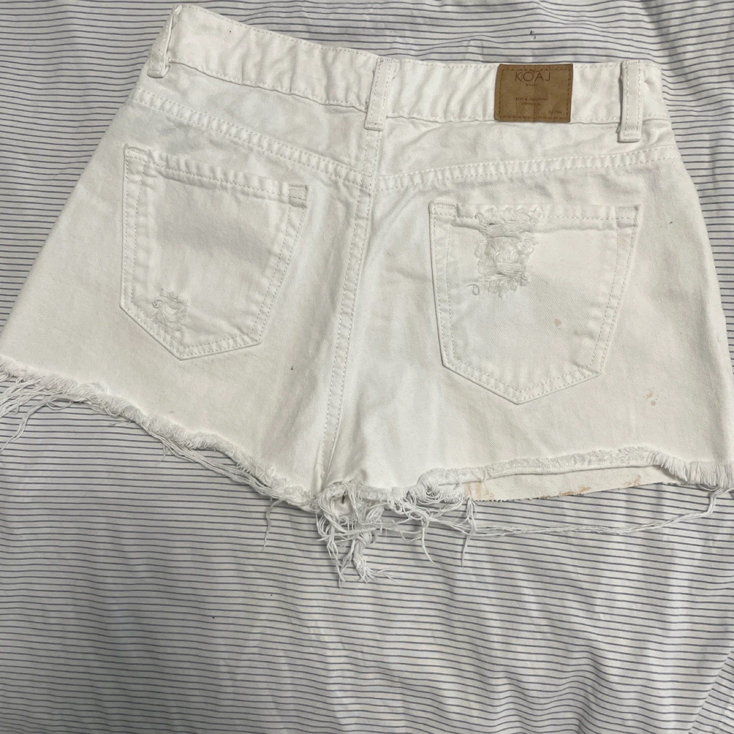 Selling a pair of white denim shorts from KOAJ. They are distressed with rips and a frayed hem. There are some stains on the shorts.