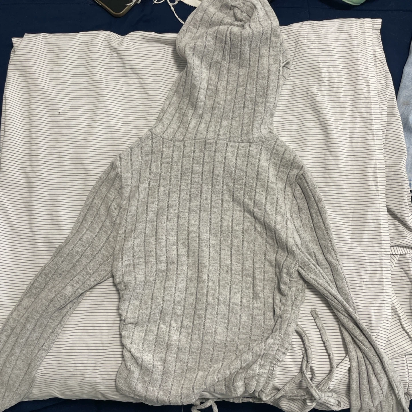 Selling a cozy gray ribbed knit hoodie. It features a comfortable hood and a stylish design. Perfect for layering or wearing on its own
