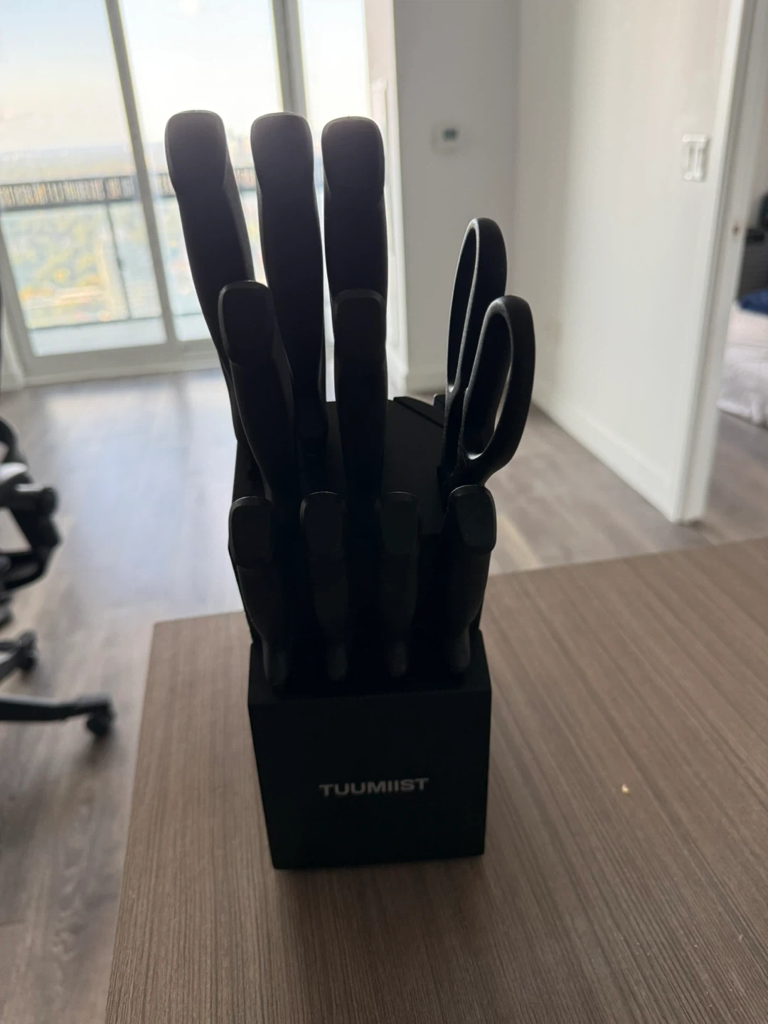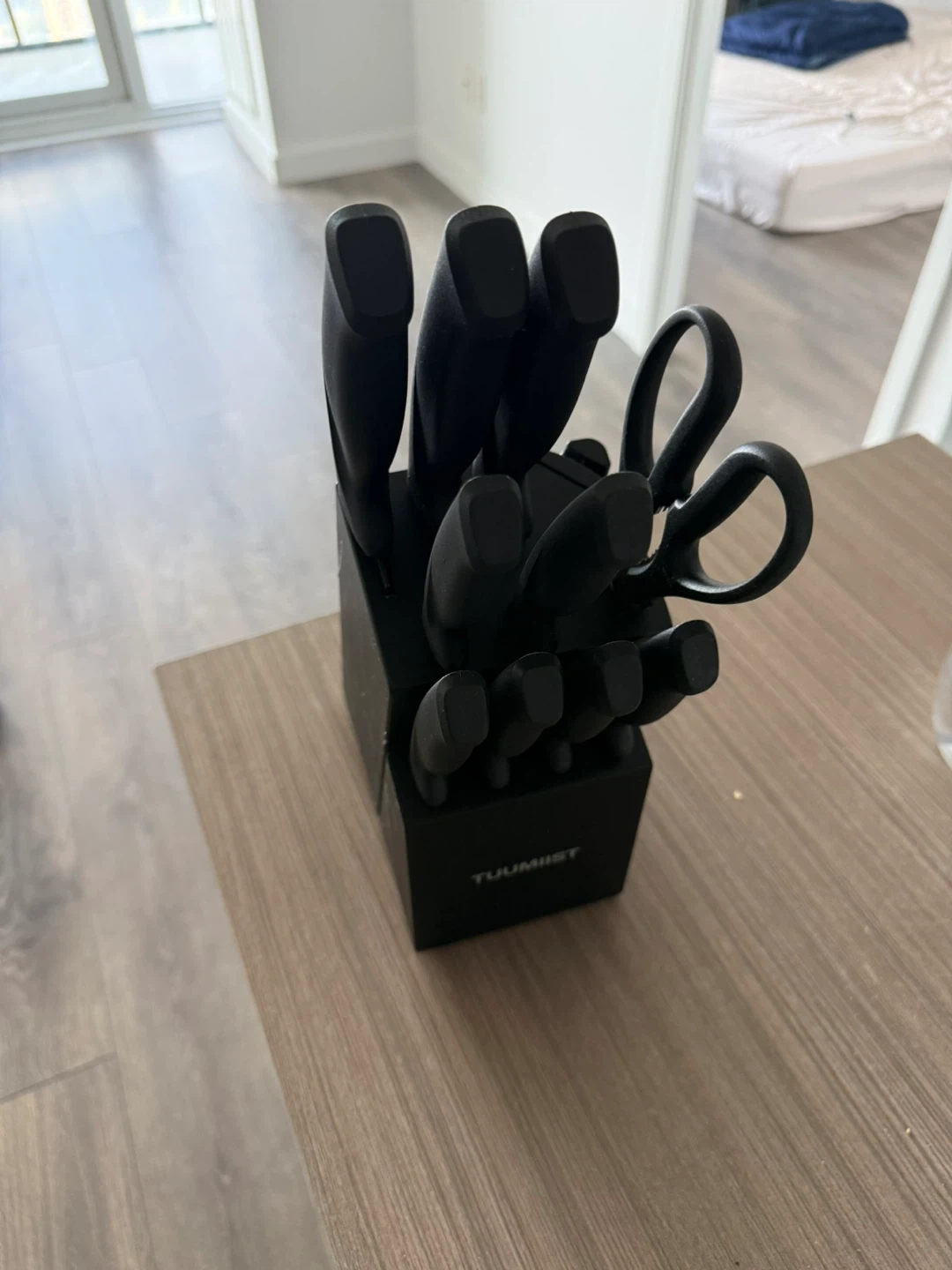 Selling a Tuumiist knife set, complete with a block to keep everything organized! This set is perfect for anyone looking to upgrade their kitchen tools. The knives are in great condition and ready to use. Also consists of small bladed tool to sharpen the knives
