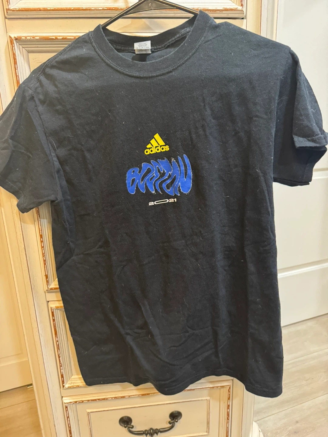 Selling a black Adidas t-shirt with the Barrow 2021 design. It's a size small and made of 100% cotton. The shirt features the Adidas logo in yellow and the Barrow design in blue. The back of the shirt has a design with the text 'THE DEDICATION. 16 WEEKS OF TRAINING. YOU'VE ALREADY WON.'