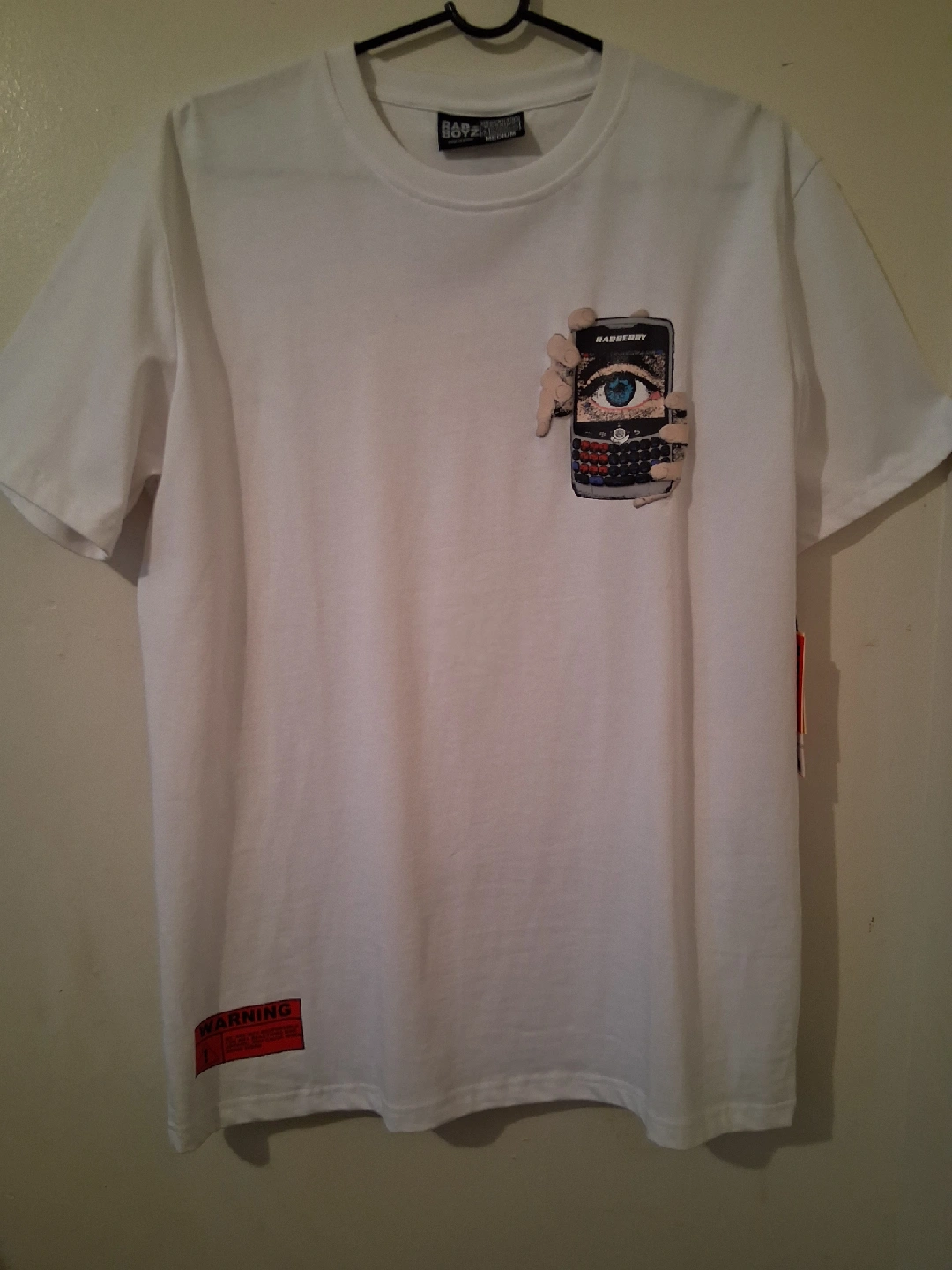 Selling a Rad Boyz Official graphic tee in size medium. The shirt is white with a unique graphic design on the front and back. The design features a Blackberry-style phone with an eye and the words "Available 24/7" and "Rad Boyz Official".