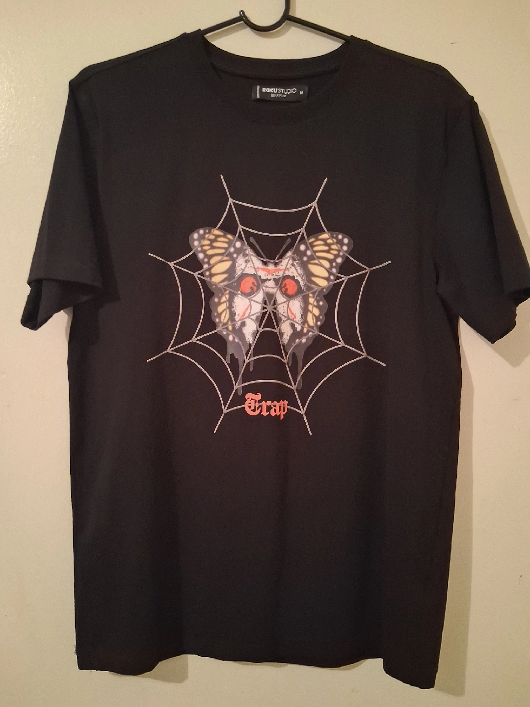 Selling a black Roku Studio t-shirt in size medium. It features a unique butterfly and spiderweb design. The shirt is in great condition. open for any trades.