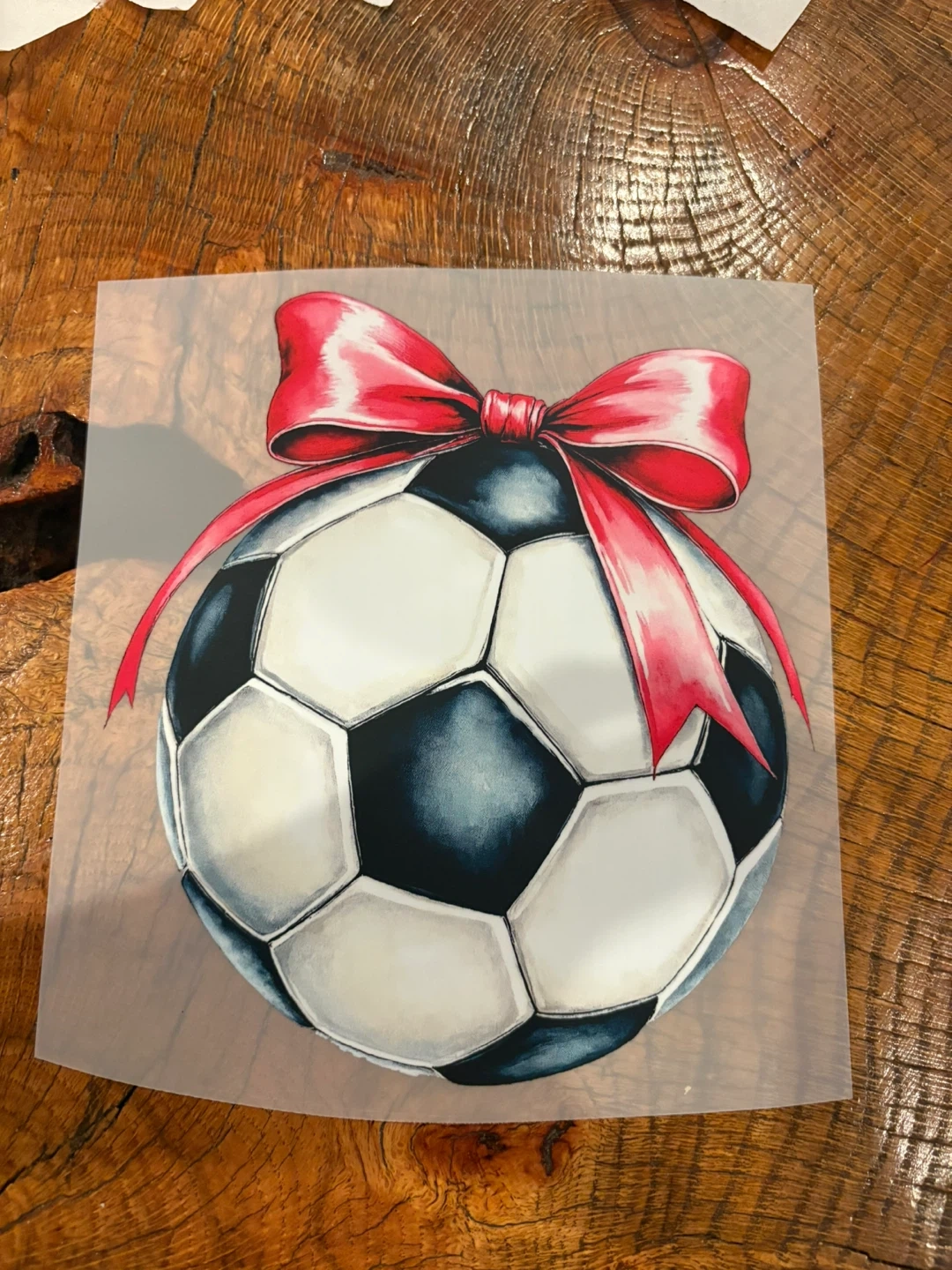 A soccer ball image with a red bow that can be made in a bag or shirt