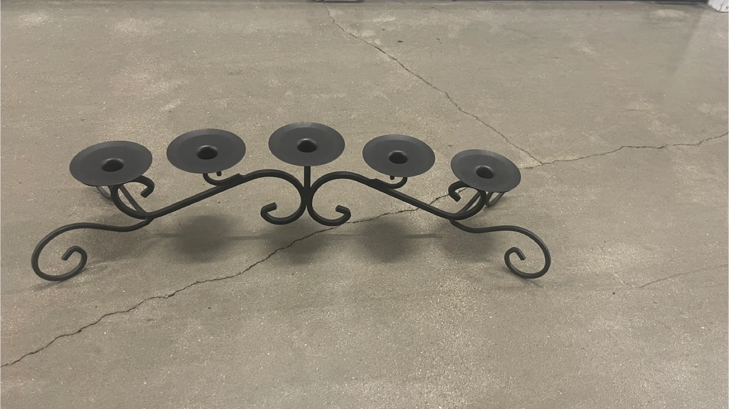 Selling a wrought iron candelabra that holds five candles! It's in great condition and would look lovely on a dining table or mantelpiece