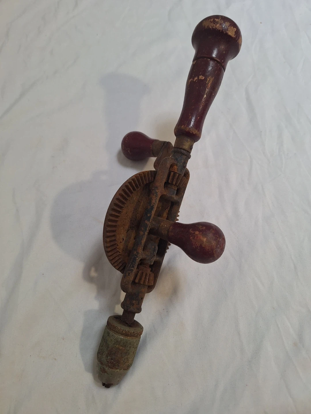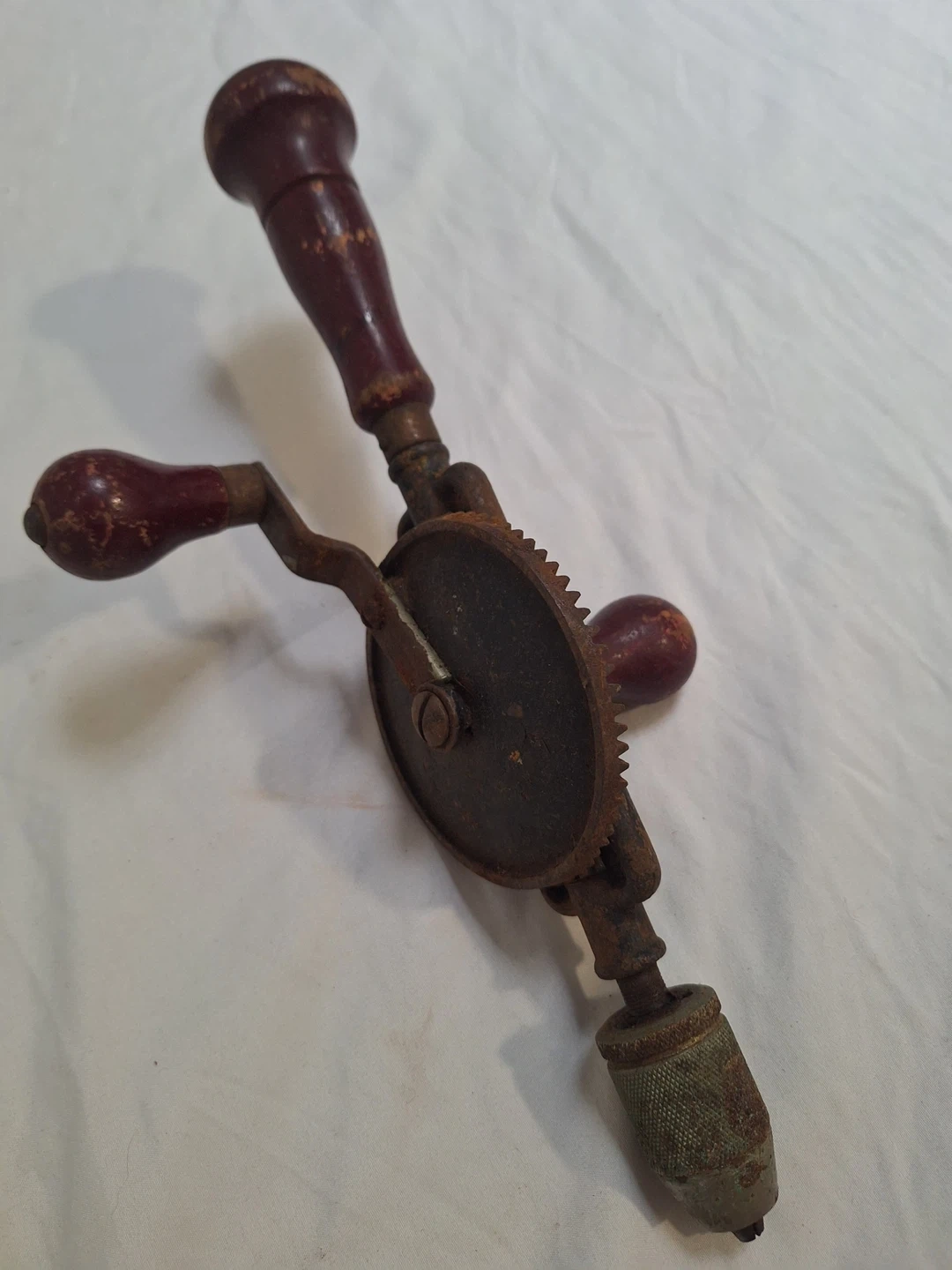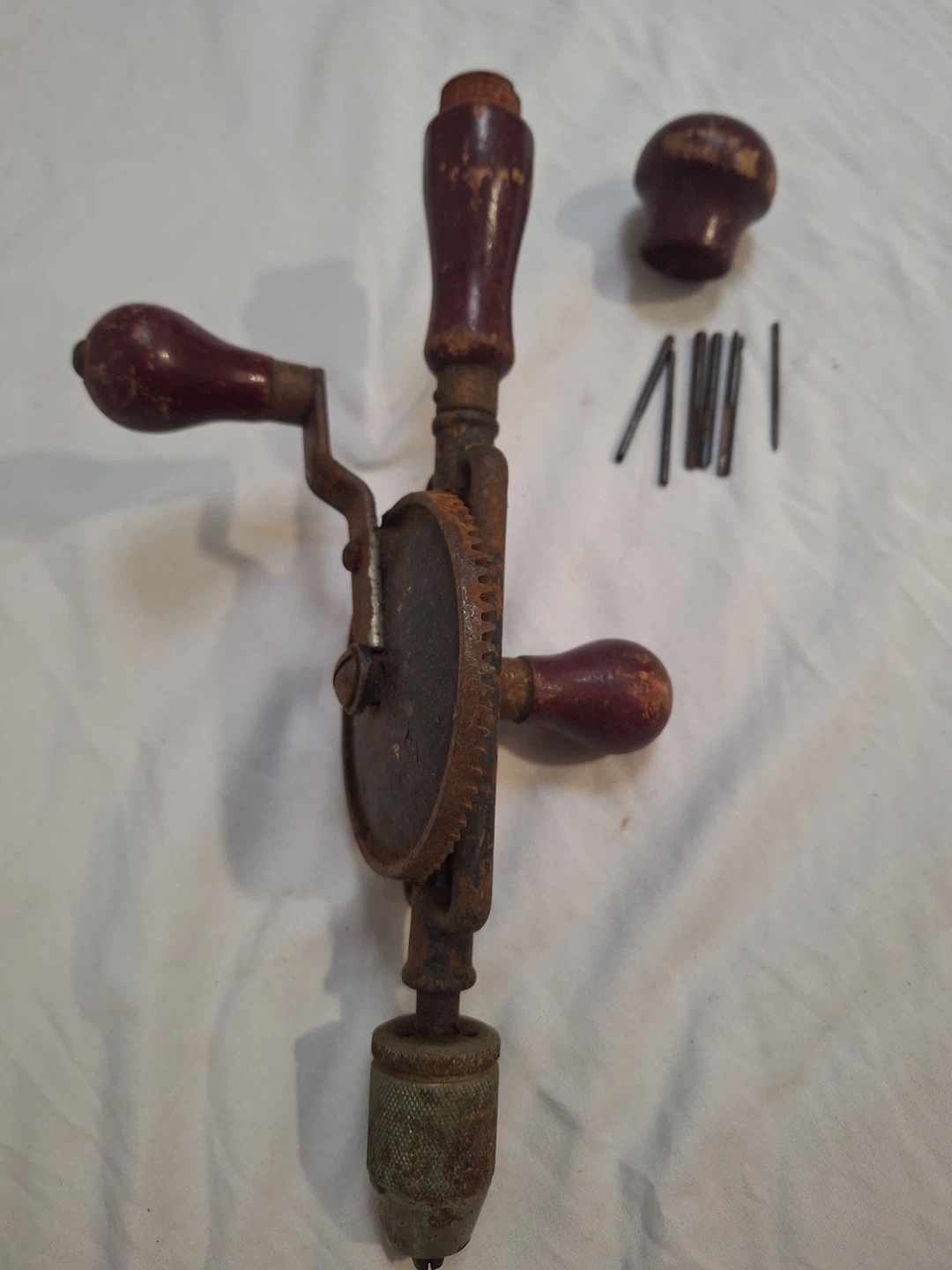Selling an antique hand drill! It shows signs of wear and rust due to its age. It comes with a few drill bits.