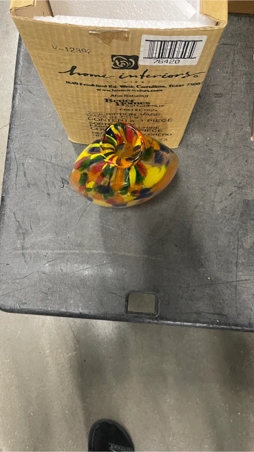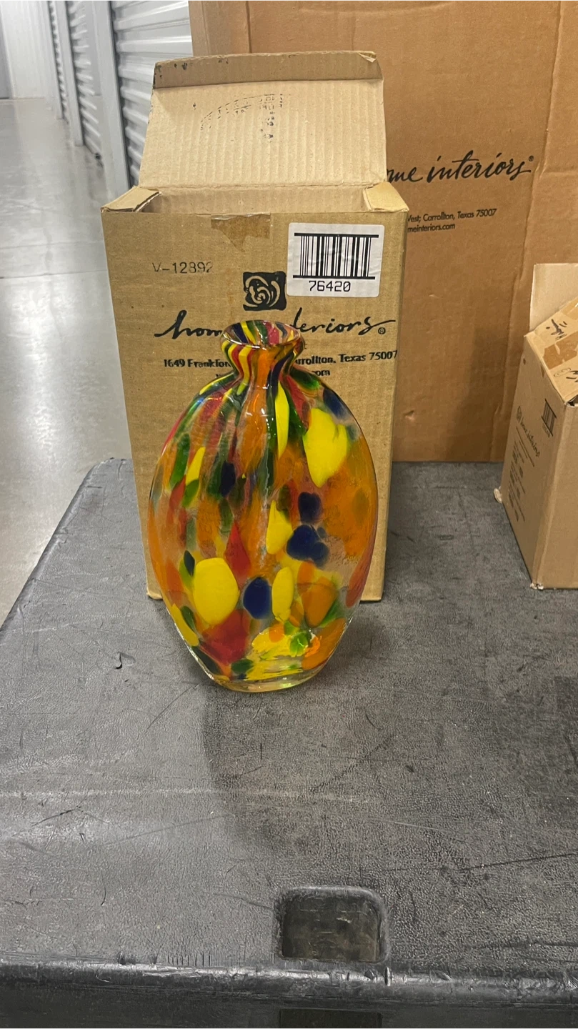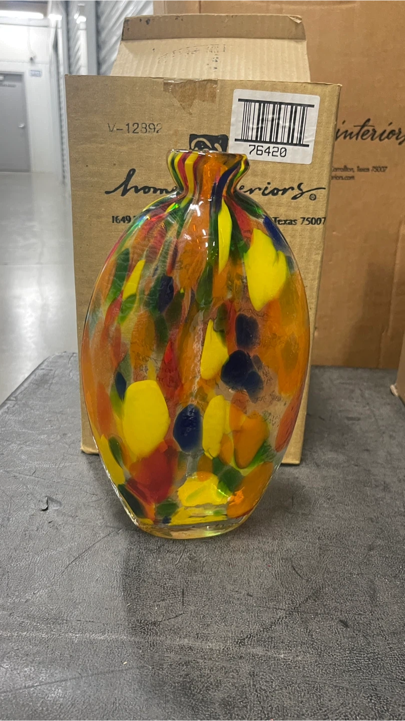 Beautiful art glass vase from Home Interiors! It features a vibrant mix of colors including yellow, red, orange, and blue. The vase comes with its original box, making it perfect for gifting or adding to your collection