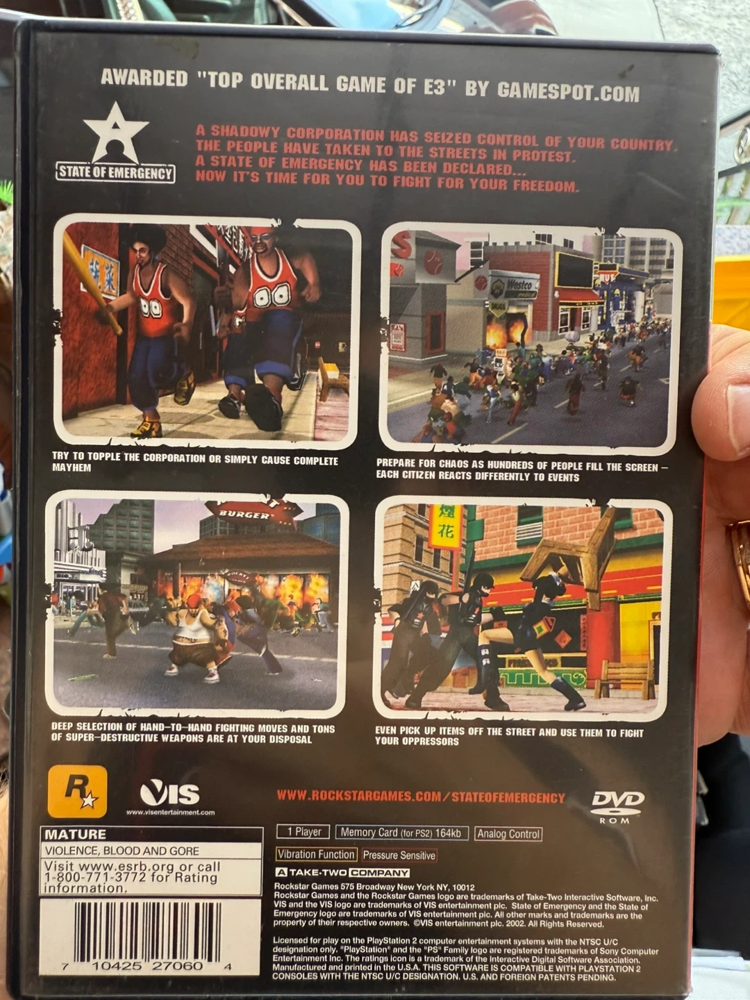 Selling a used copy of State of Emergency for Playstation 2. Rated M for Mature, it features violence, blood, and gore. Get ready to topple the corporation or simply cause complete mayhem! Ready for pick up, also check out my other games available.